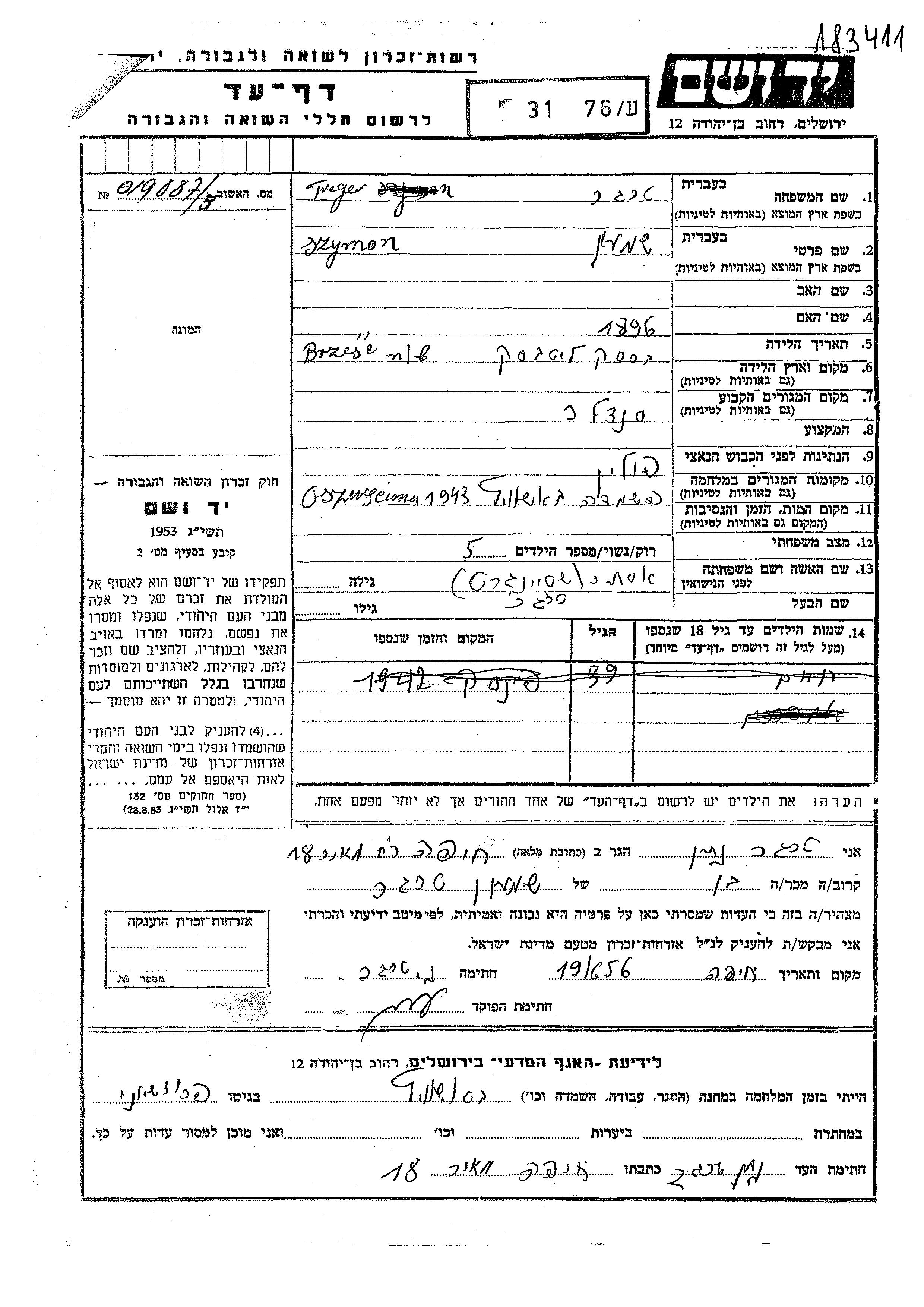 Szymon Treger was born in Brzesc, Poland, 1896. He was a shoemaker. During the war he was in Poland.