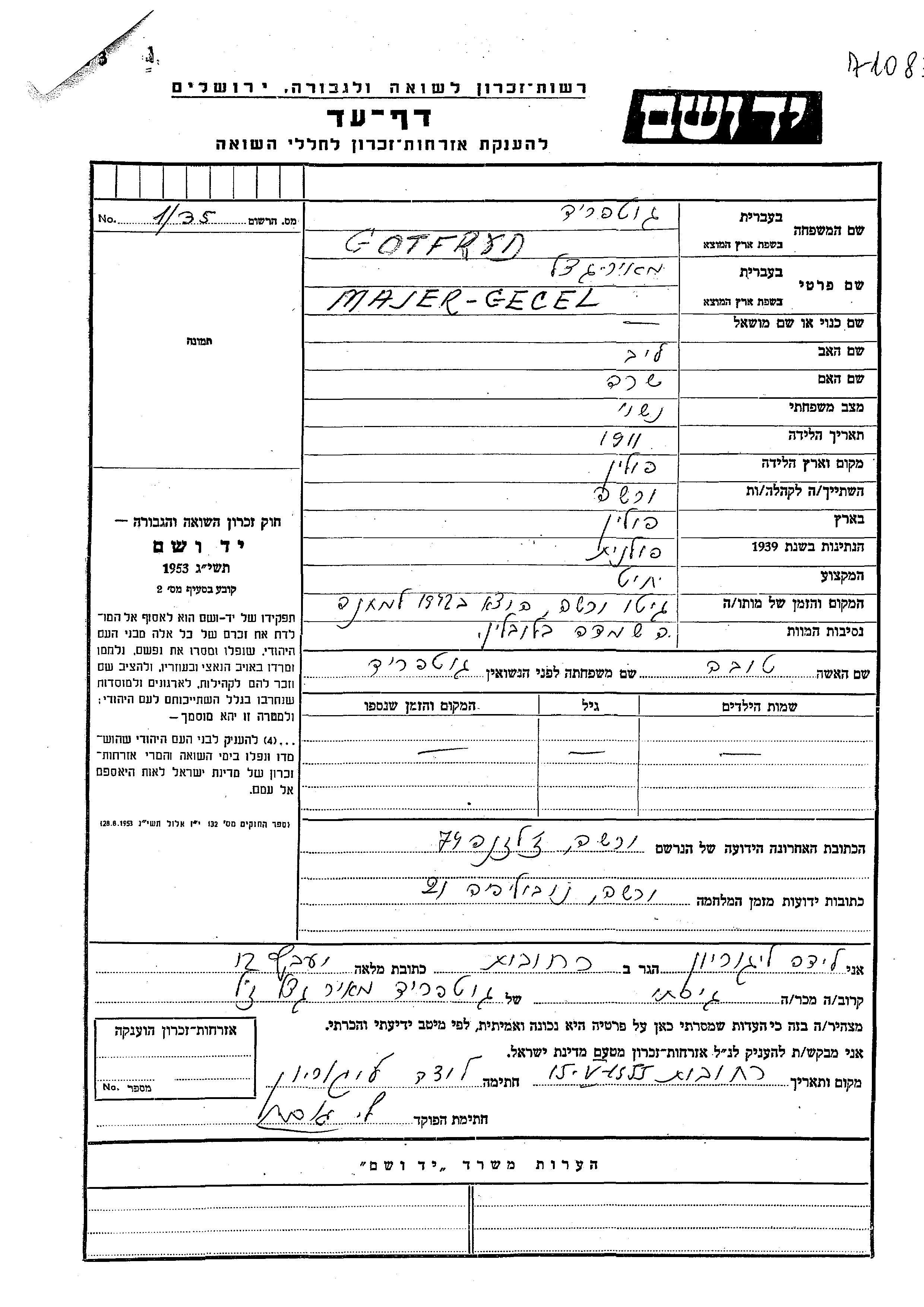 Majer Gecel Gotfryd was born in Poland, 1911 to Leib and Sara. He was a tailor and married to Tova. Prior to WWII he lived in Warsaw, Poland. During the war he was in Warsaw, Poland.