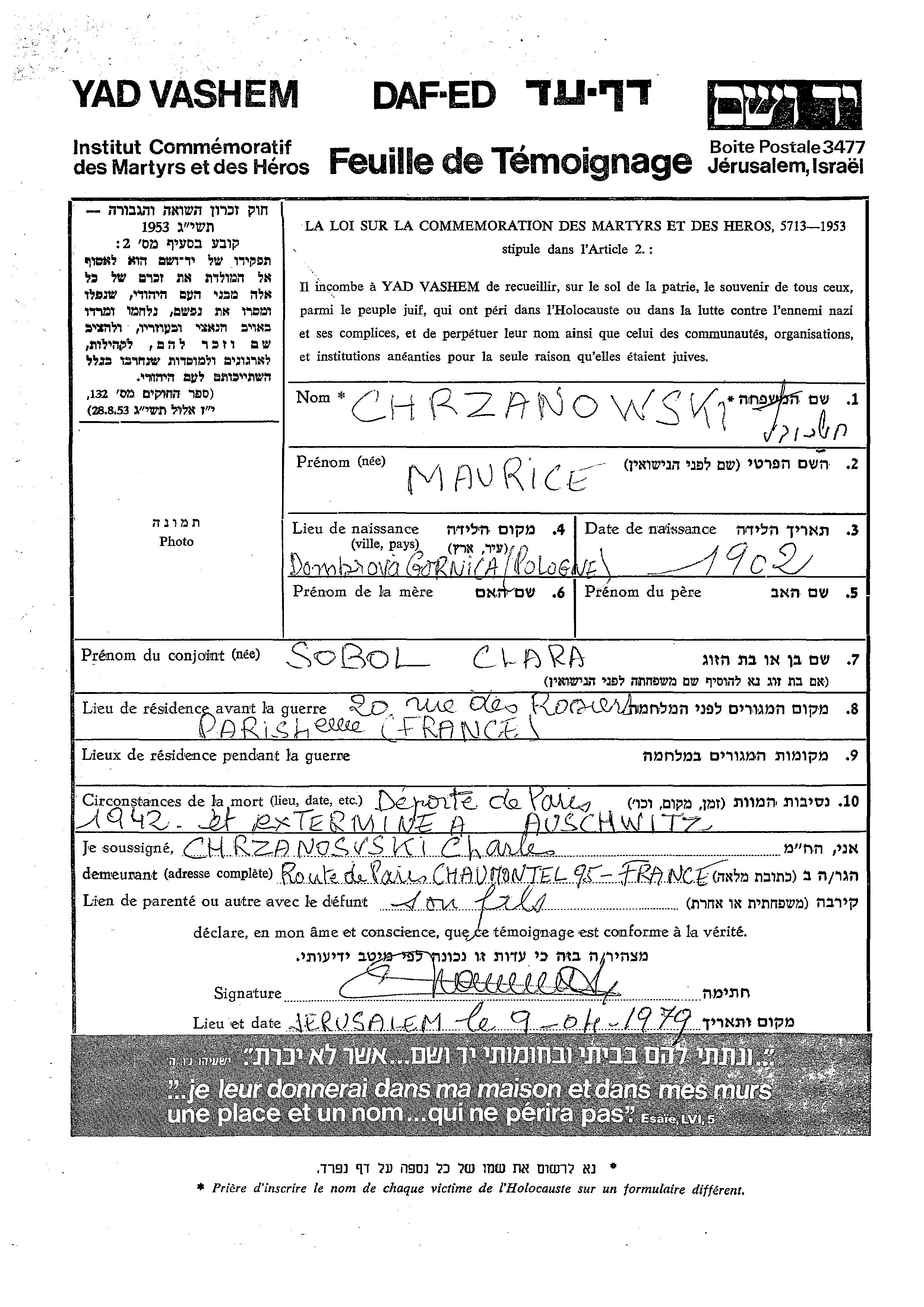 Maurice Chrzanowski Khshanovitz was born in Dombrowa Gornicza, Poland, 1902. Prior to WWII he lived in Paris, France. Maurice was murdered in the Shoah. Place of death: Auschwitz, Poland, 1942.