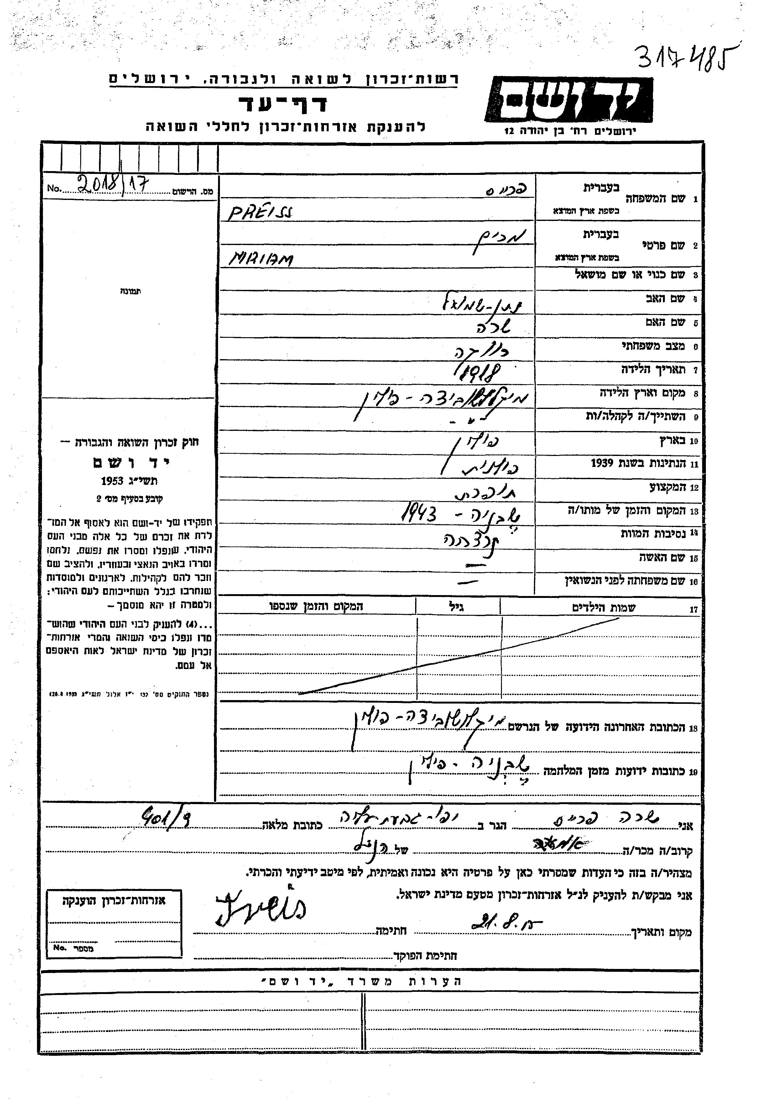 Mriam Preiss was born in Mikluszowice, Poland, 1918 to Natan Shmuel and Sara. She was a seamstress and single. Prior to WWII she lived in Mikluszowice, Poland. During the war she was in Szebnie, Poland. Mriam was murdered in the Shoah. Place of death: Szebnie, Poland, 1943.