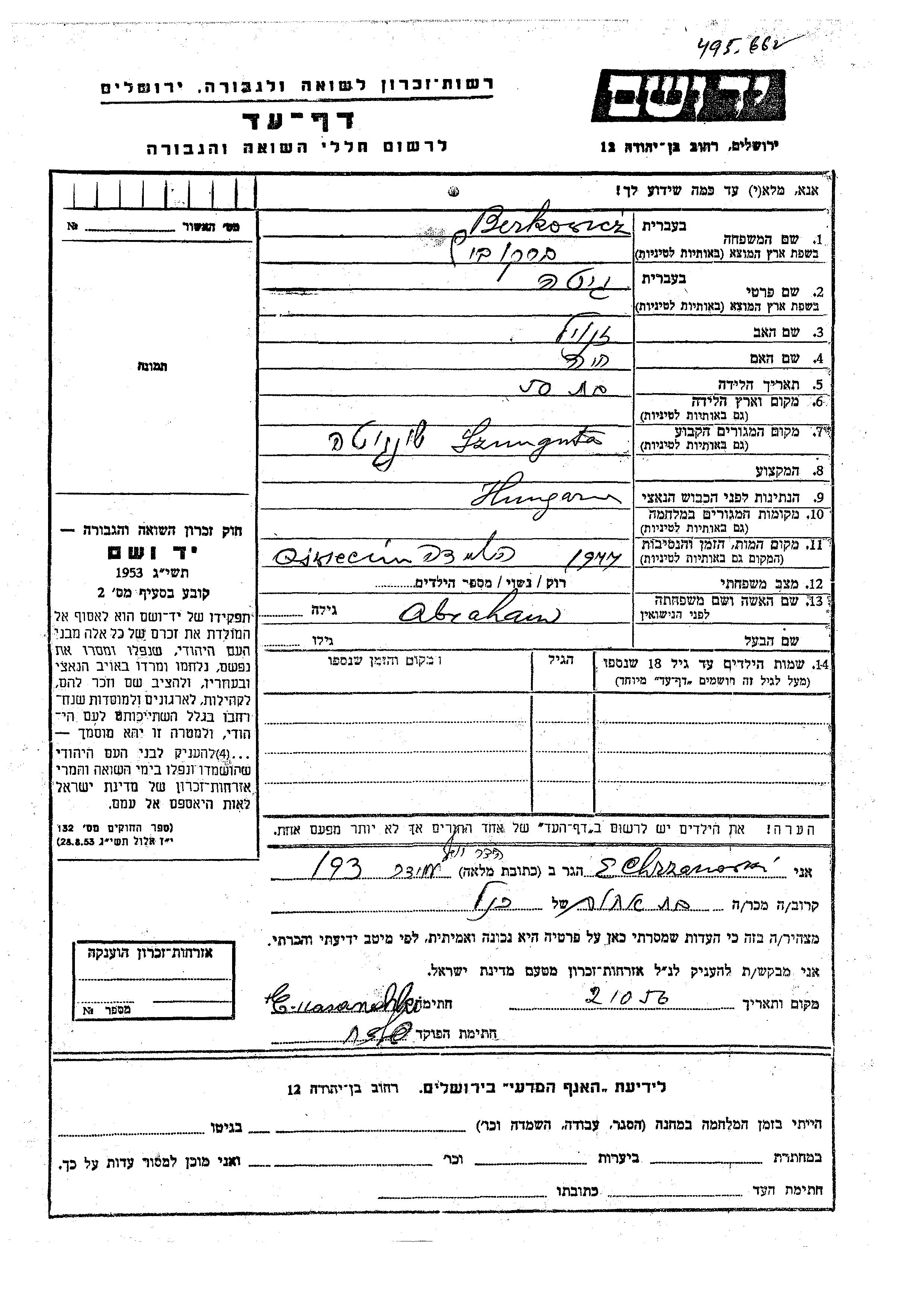 Gita Berkovicz nee Abraham was born to Zanvil and Khaia. She was married. Prior to WWII she lived in Sengotar, Hungary. Gita was murdered in the Shoah. Place of death: Auschwitz, Poland, 1944.