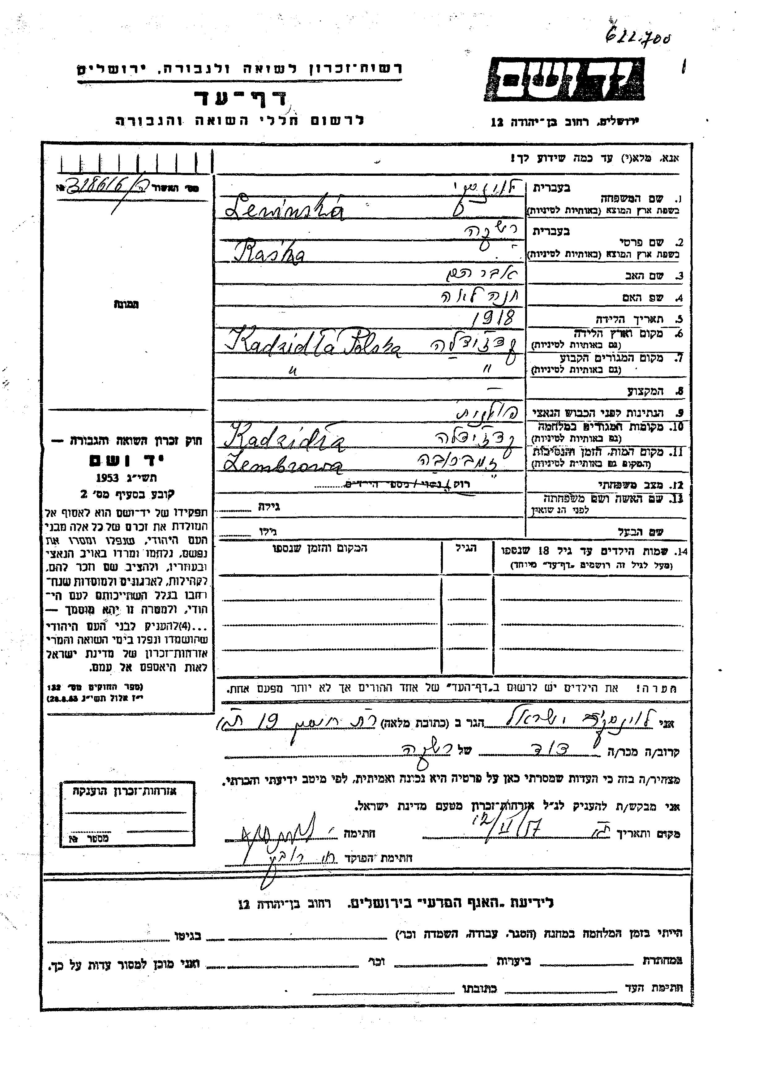 Raska Levinska was born in Kadzidlo, Poland, 1918 to Avraham and Khana Lea. She was single. Prior to WWII she lived in Kadzidlo, Poland. During the war she was in Kadzidlo, Poland. Raska was murdered in the Shoah. Place of death: Zembrow, Poland.
