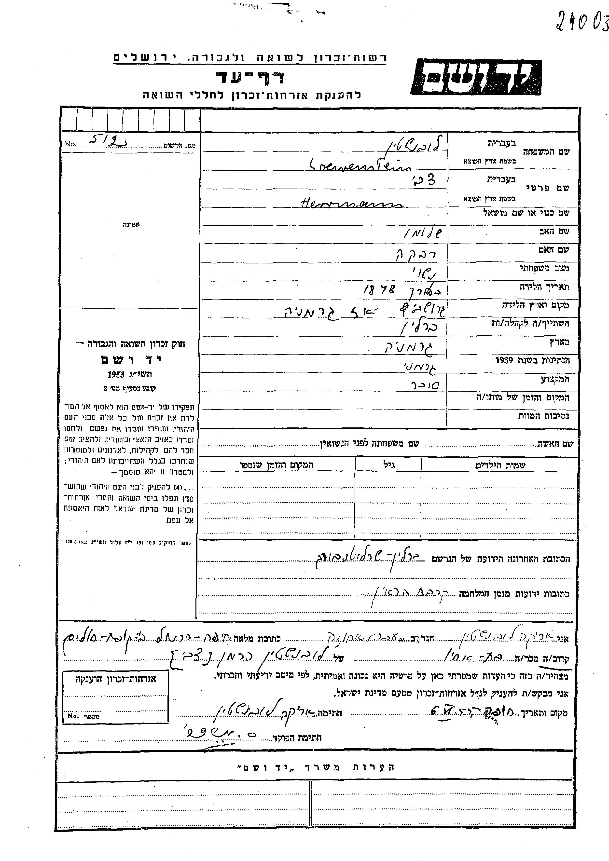 Herrmann Tzvi Loewenstein Lubenshtein was born in Kruschwitz, Poland, 1878 to Shlomo and Rivka. He was a merchant and married. Prior to WWII he lived in Berlin, Germany. During the war he was in Berlin, Germany. Herrmann Tzvi was murdered in the Shoah.
