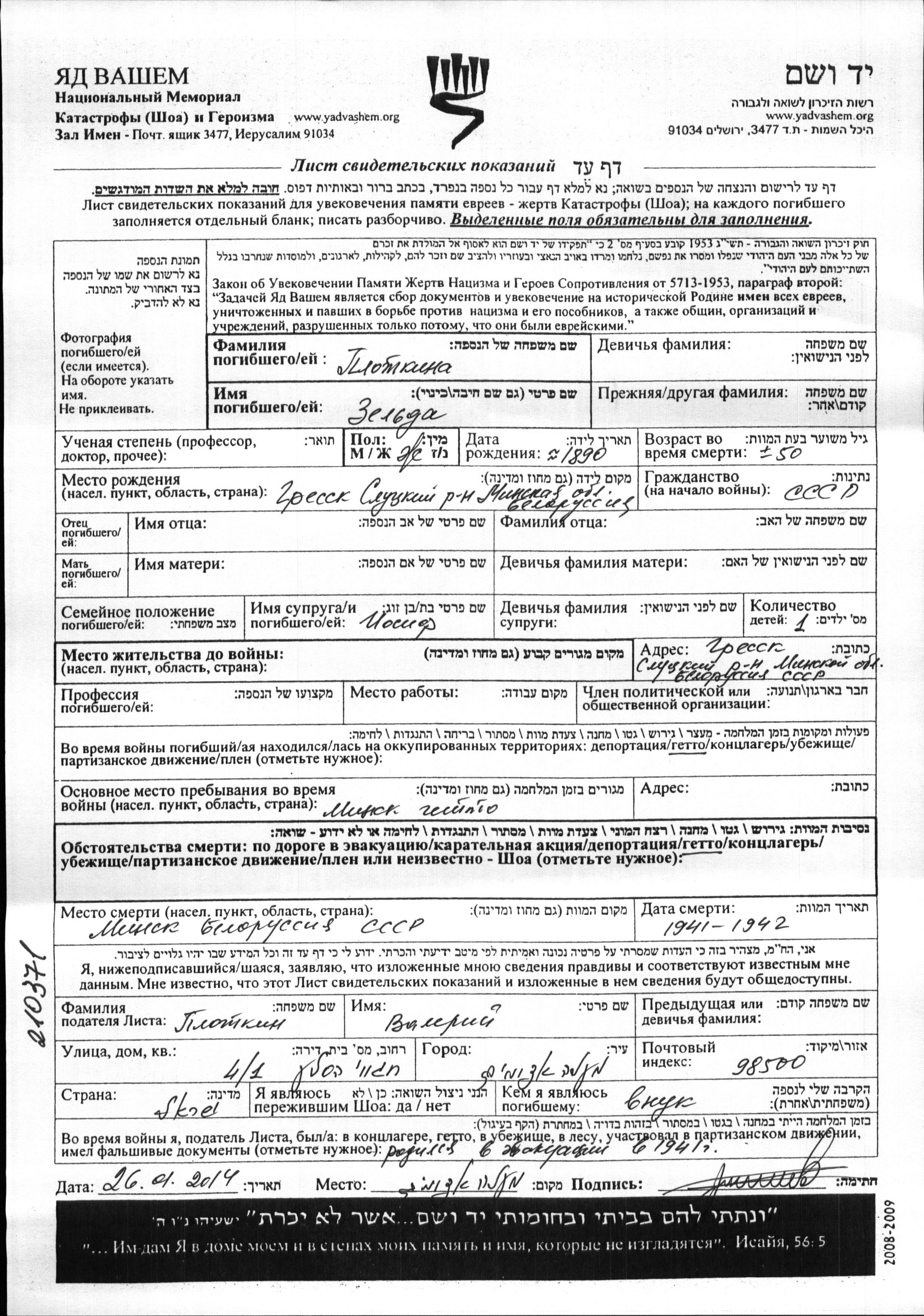 Zelda Plotkina was born in Gressk, Belorussia (USSR), 1890. She was married to Iosif. Prior to WWII she lived in Gressk, Belorussia (USSR). During the war she was in Minsk, Belorussia (USSR). Zelda was murdered in the Shoah. Place of death: Minsk, Belorussia (USSR), 1941.