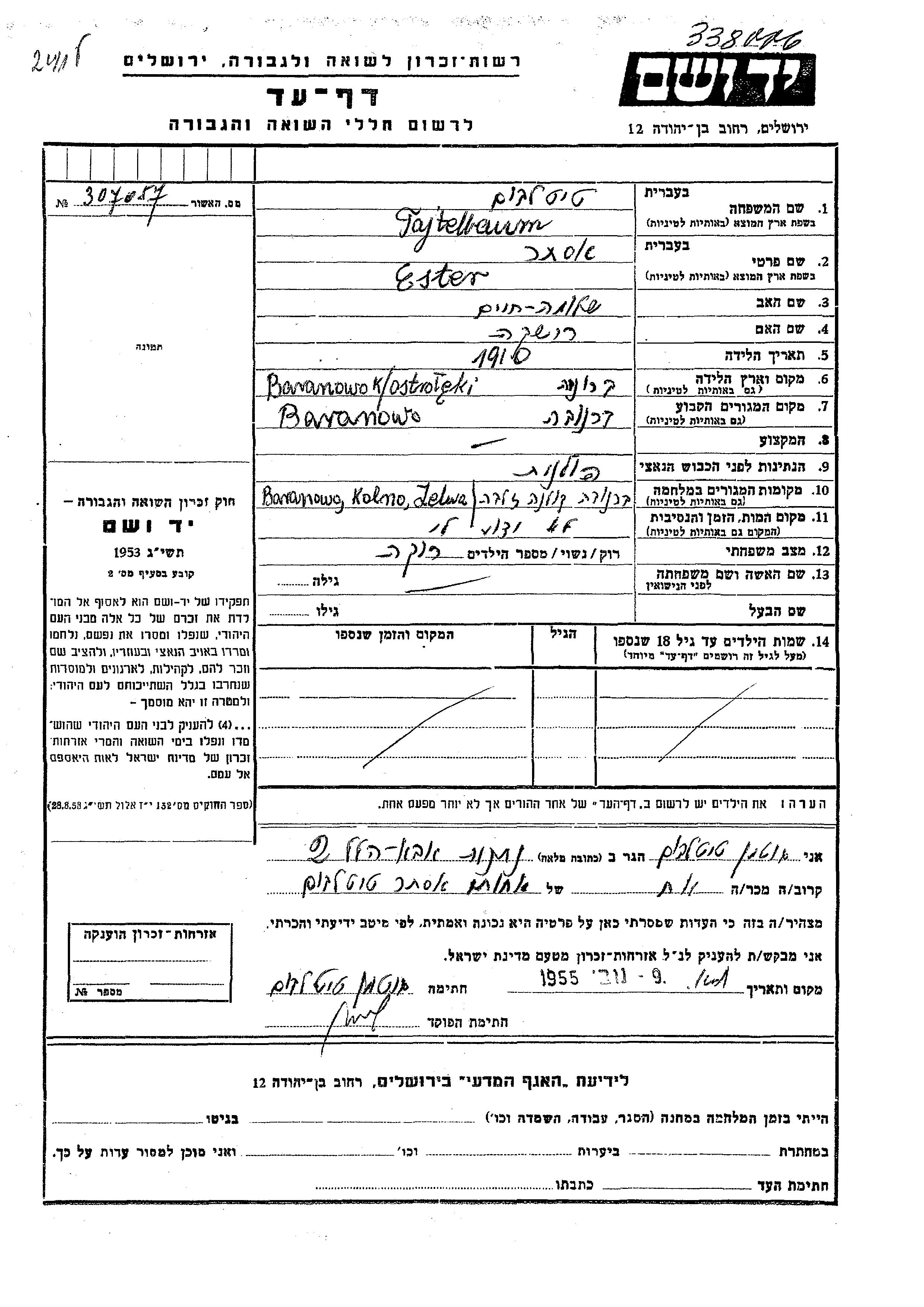 Ester Tajtelbaum was born in Baranowo, Poland, 1910 to Shlomo Khaim and Rushka. She was single. Prior to WWII she lived in Baranowo, Poland. During the war she was in Zelve, Lithuania. Ester was murdered in the Shoah.