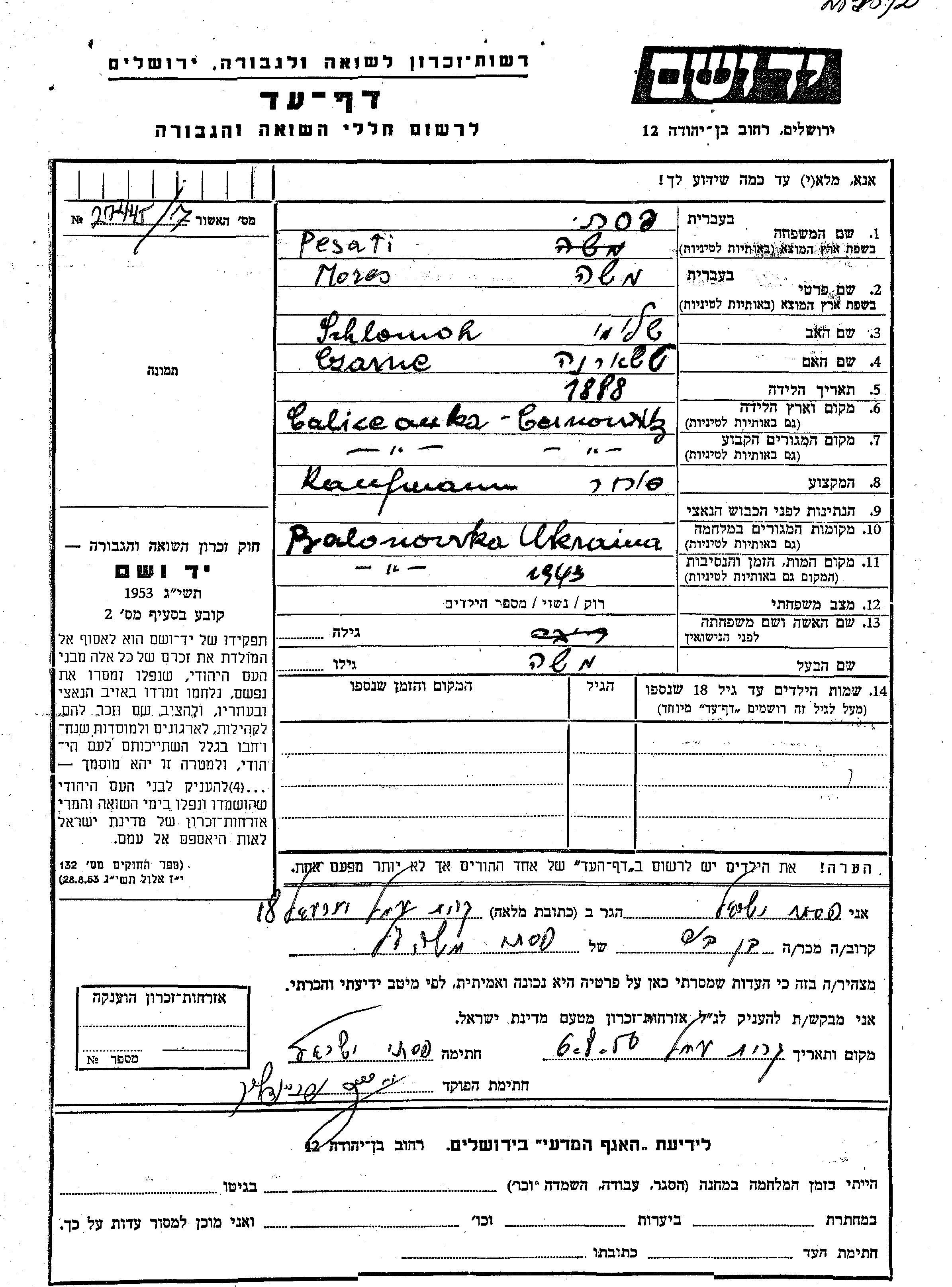 Mozhes Pesati was born in Colicauti, Romania, 1888 to Schlomoh and Czarne. He was a merchant. Prior to WWII he lived in Colicauti, Romania. During the war he was in Bolonovka, Ukraine (USSR).