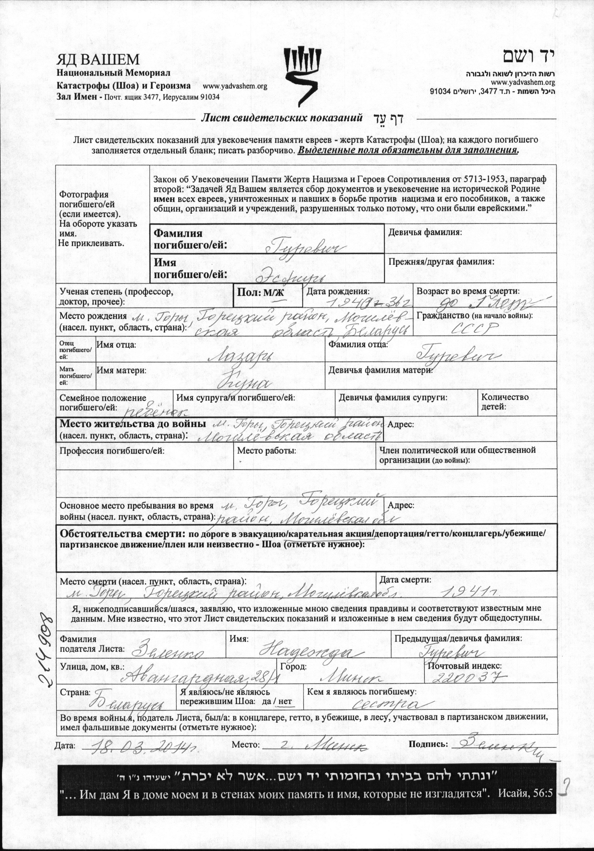 Esfir Gurevich was born in Gory, Belorussia (USSR), 1936 to Lazar and Kuna. She was child. Prior to WWII she lived in Gory, Belorussia (USSR). During the war she was in Gory, Belorussia (USSR). Esfir was murdered in the Shoah. Place of death: Gory, Belorussia (USSR), 1941.