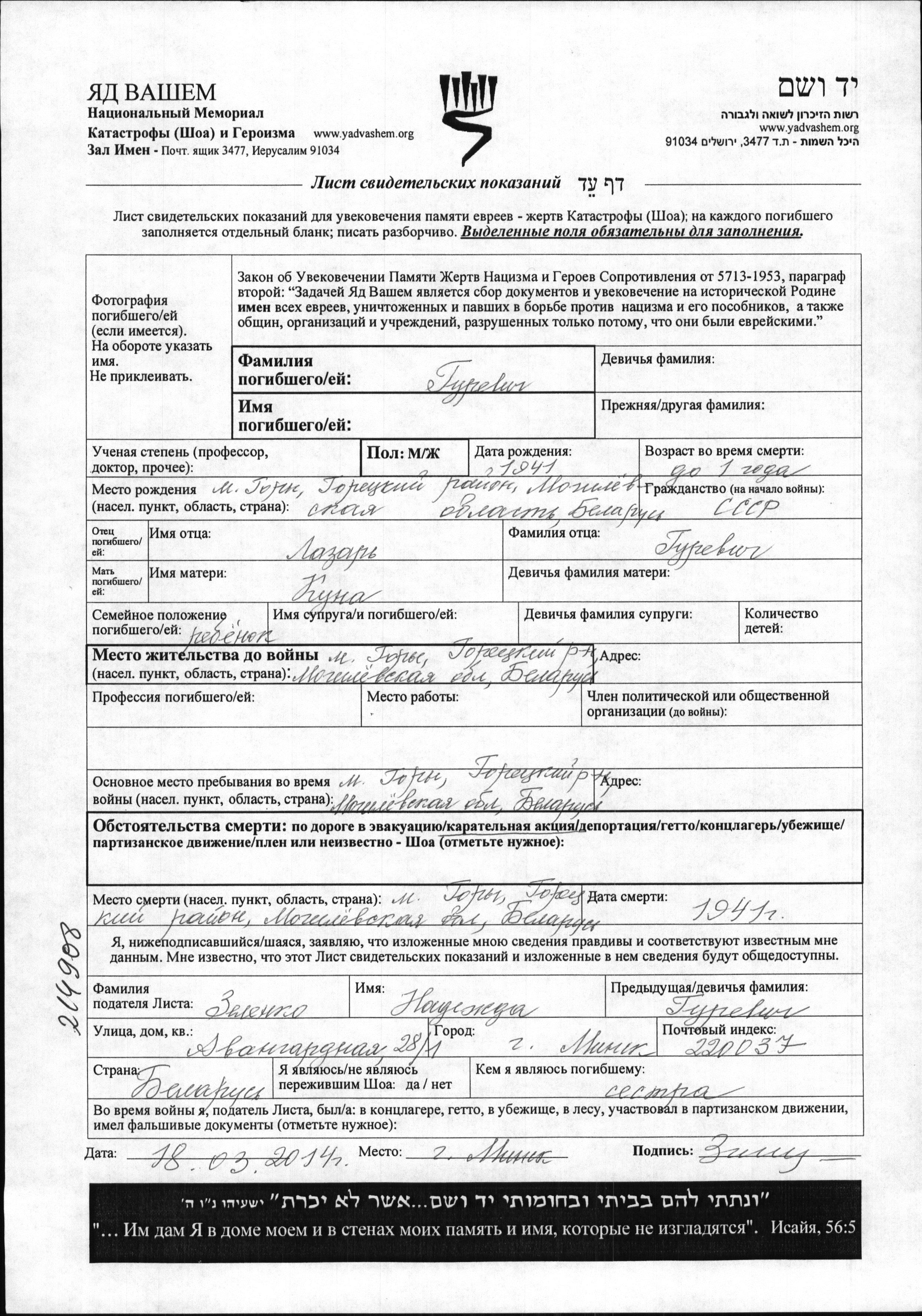 First name unknown Gurevich was born in Gory, Belorussia (USSR), 1941 to Lazar and Kuna. Was baby. Prior to WWII lived in Gory, Belorussia (USSR). During the war was in Gory, Belorussia (USSR). Was murdered in the Shoah. Place of death: Gory, Belorussia (USSR), 1941.