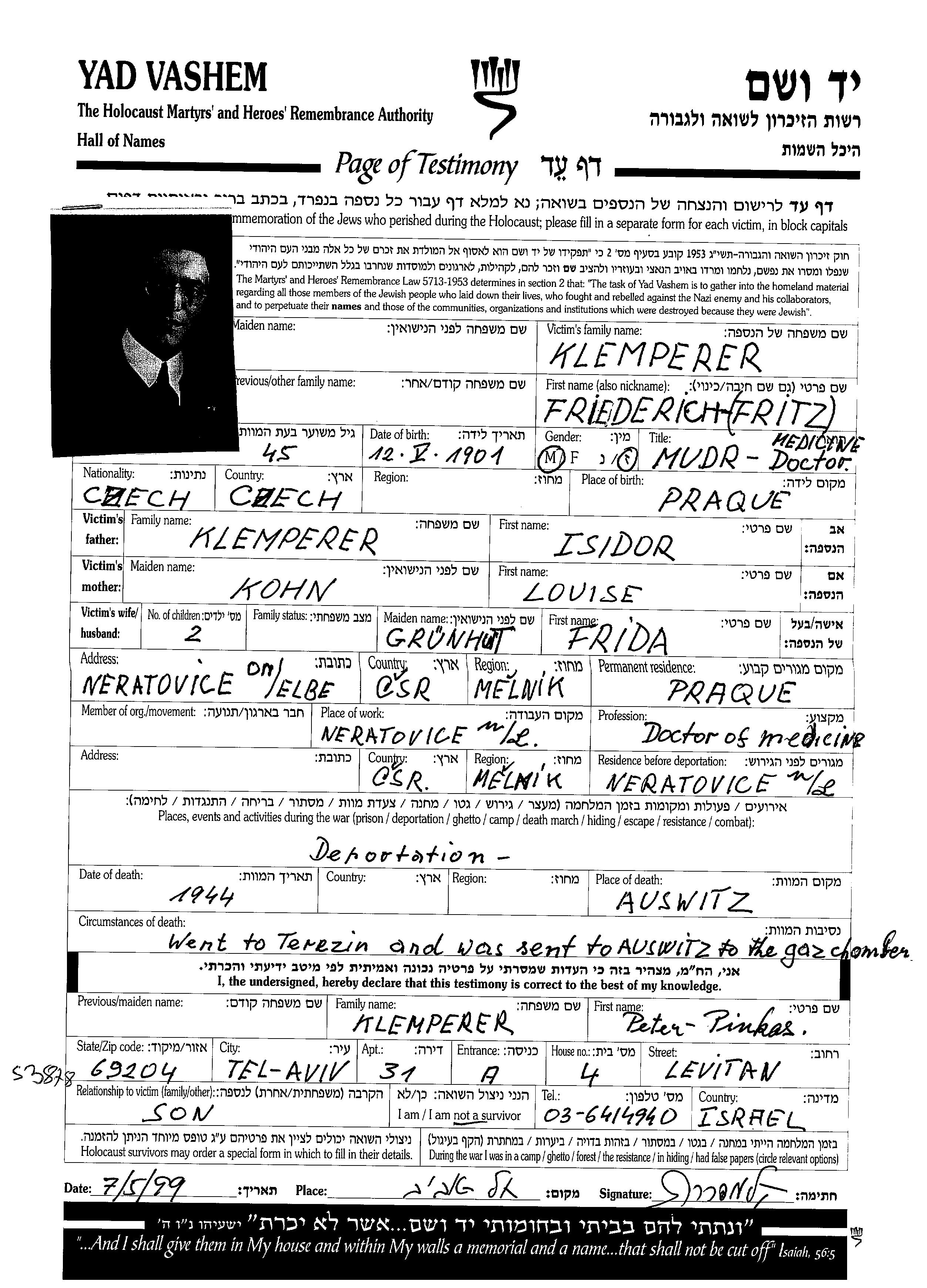 Dr. Friedrich Klemperer was born in Prague, Czechoslovakia in 1901 to Isidor and Louise. He was a physician and married to Frida nee Gruenhut. Prior to WWII he lived in Prague, Czechoslovakia. During the war he was in Neratovice, Czechoslovakia. Dr. Klemperer was murdered in the Shoah. Place of death: Auschwitz, Poland in 1944.