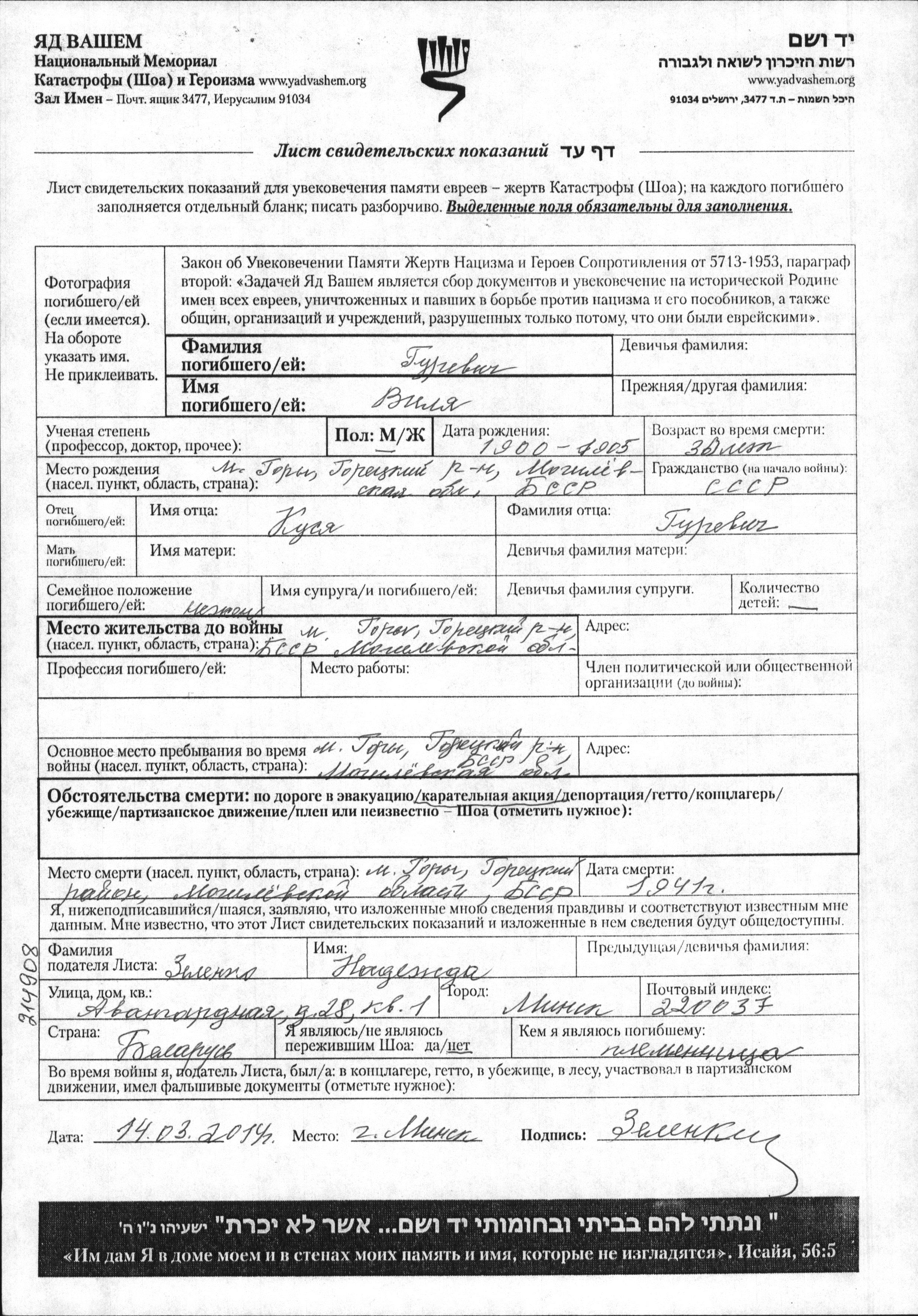 Vilya Gurevich was born in Gory, Belorussia (USSR), 1900 to Kusya. He was single. Prior to WWII he lived in Gory, Belorussia (USSR). During the war he was in Gory, Belorussia (USSR). Vilya was murdered in the Shoah. Place of death: Gory, Belorussia (USSR), 1941.