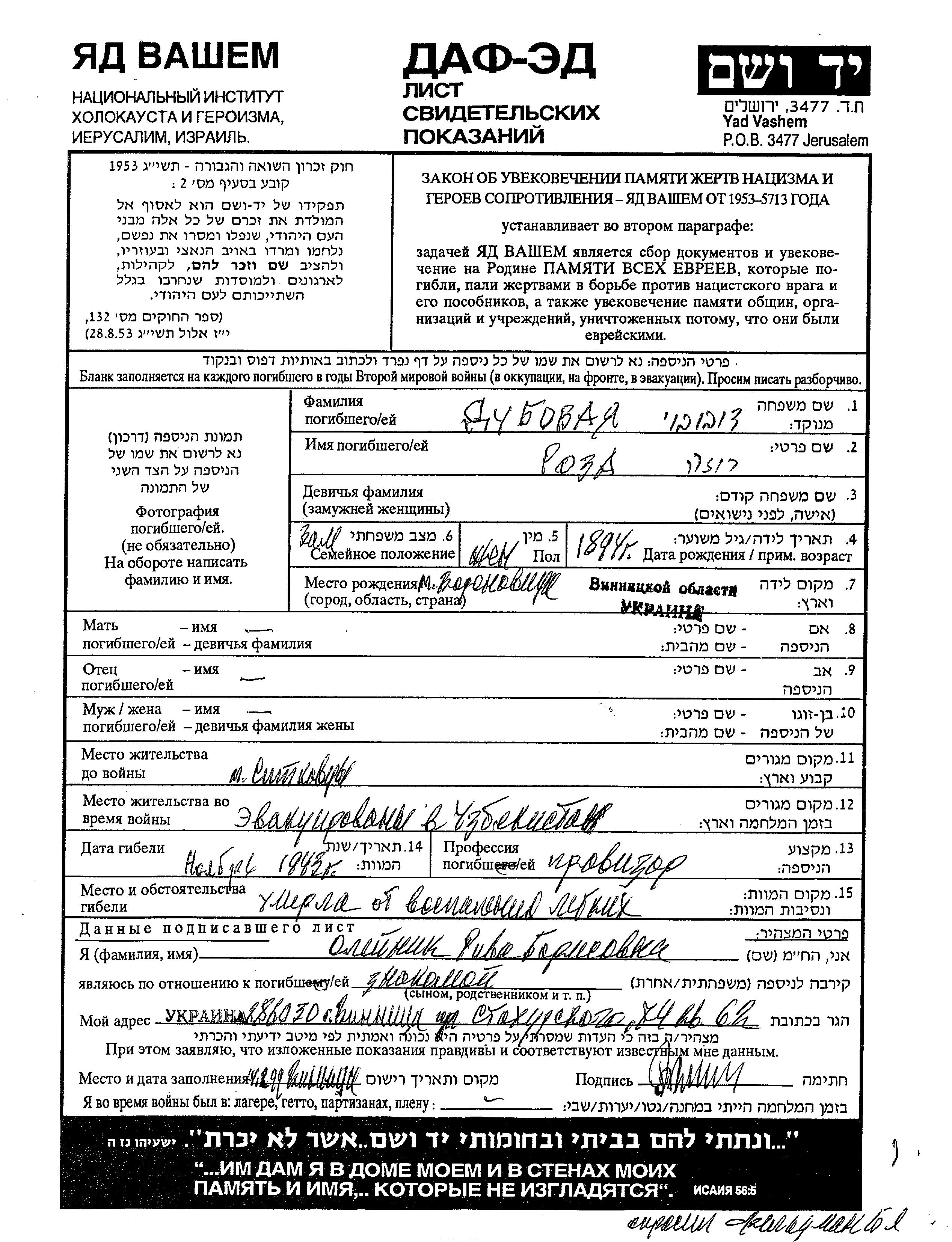 Roza Dubovaya was born in Voronovitsa, Ukraine (USSR), 1894. She was a pharmacist and married. Prior to WWII she lived in Sitkovtsy, Ukraine (USSR). During the war she was in Uzbekistan (USSR). Roza was registered following the evacuation/ in the interior of the Soviet Union.