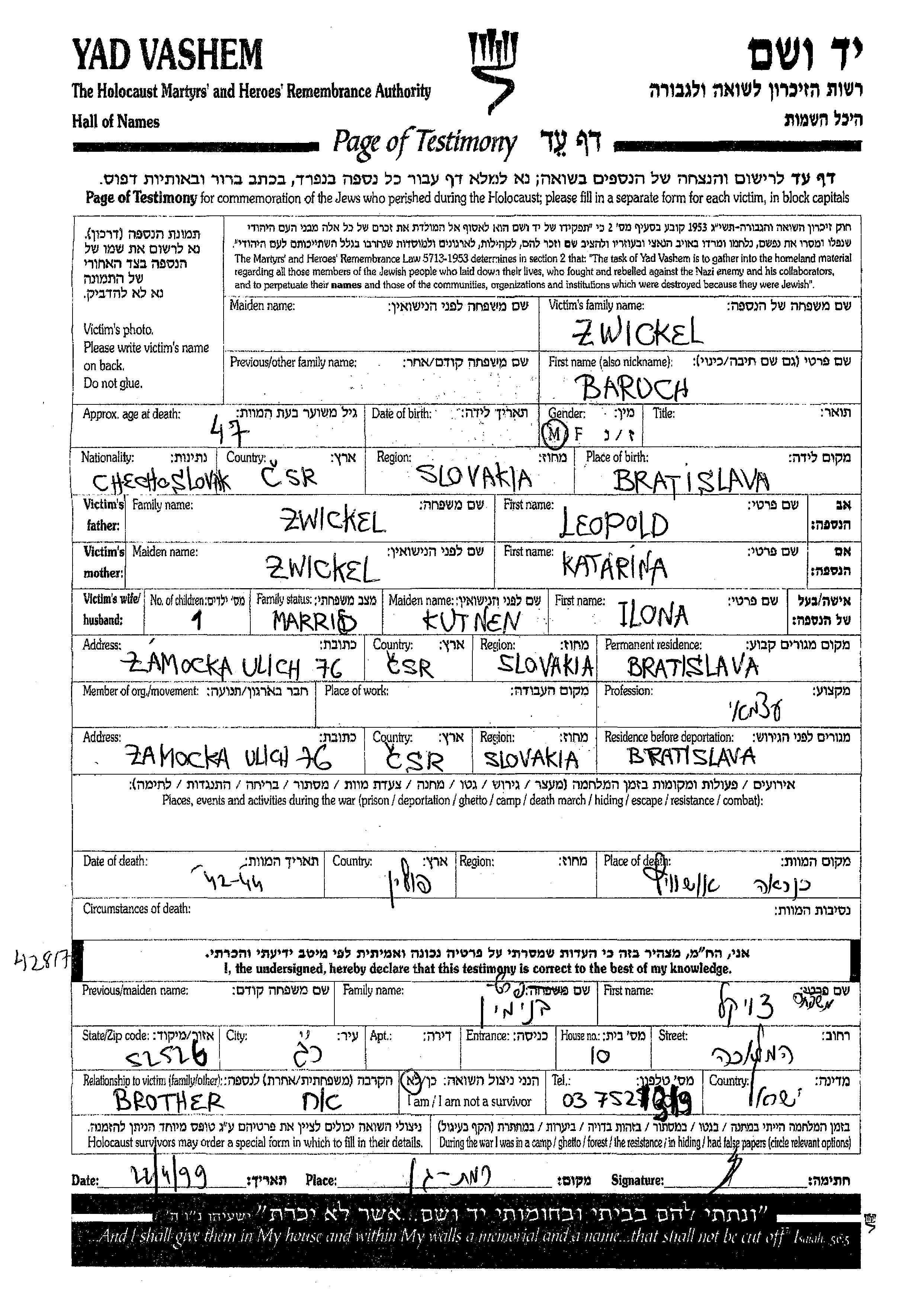 Zwickel Baroch Bratislava, Czechoslovakia Page of Testimony