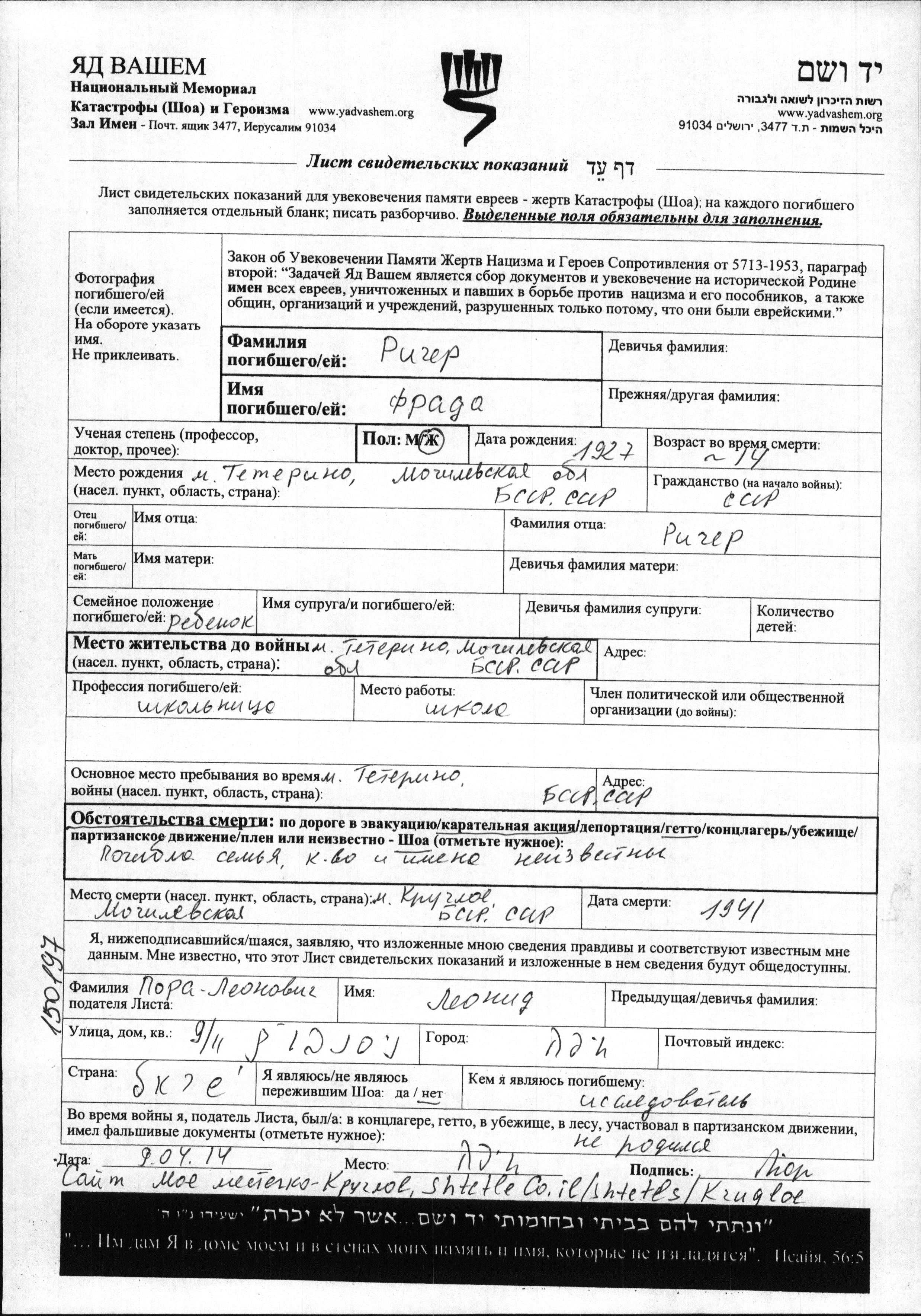 Frada Riger was born in Teterino, Belorussia (USSR), 1927. She was a pupil and teenager. Prior to WWII she lived in Teterino, Belorussia (USSR). During the war she was in Teterino, Belorussia (USSR). Frada was murdered in the Shoah. Place of death: Krugloye, Belorussia (USSR), 1941.