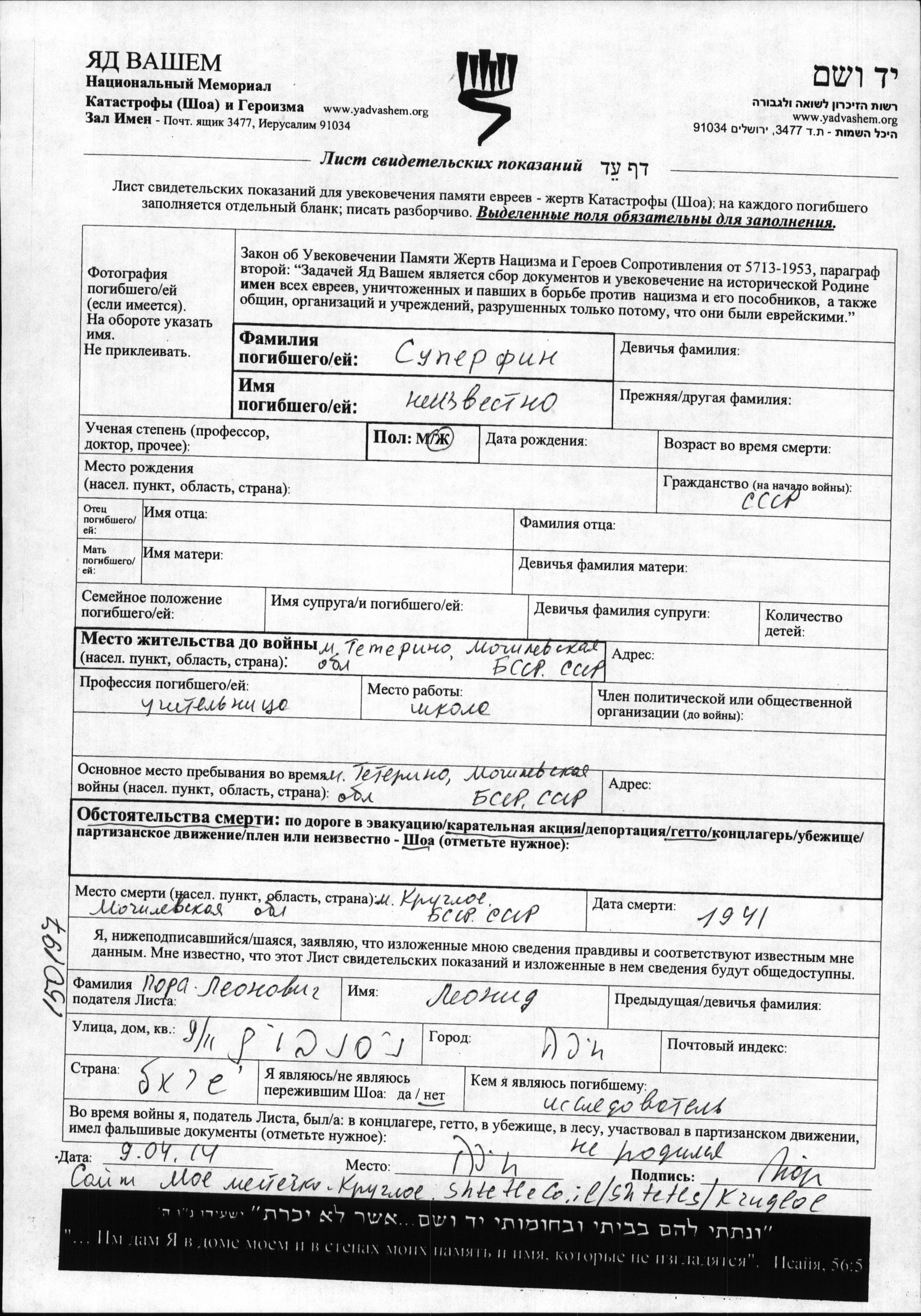 First name unknown Superfin. She was a teacher. Prior to WWII she lived in Teterino, Belorussia (USSR). During the war she was in Teterino, Belorussia (USSR). She was murdered in the Shoah. Place of death: Krugloye, Belorussia (USSR), 1941.