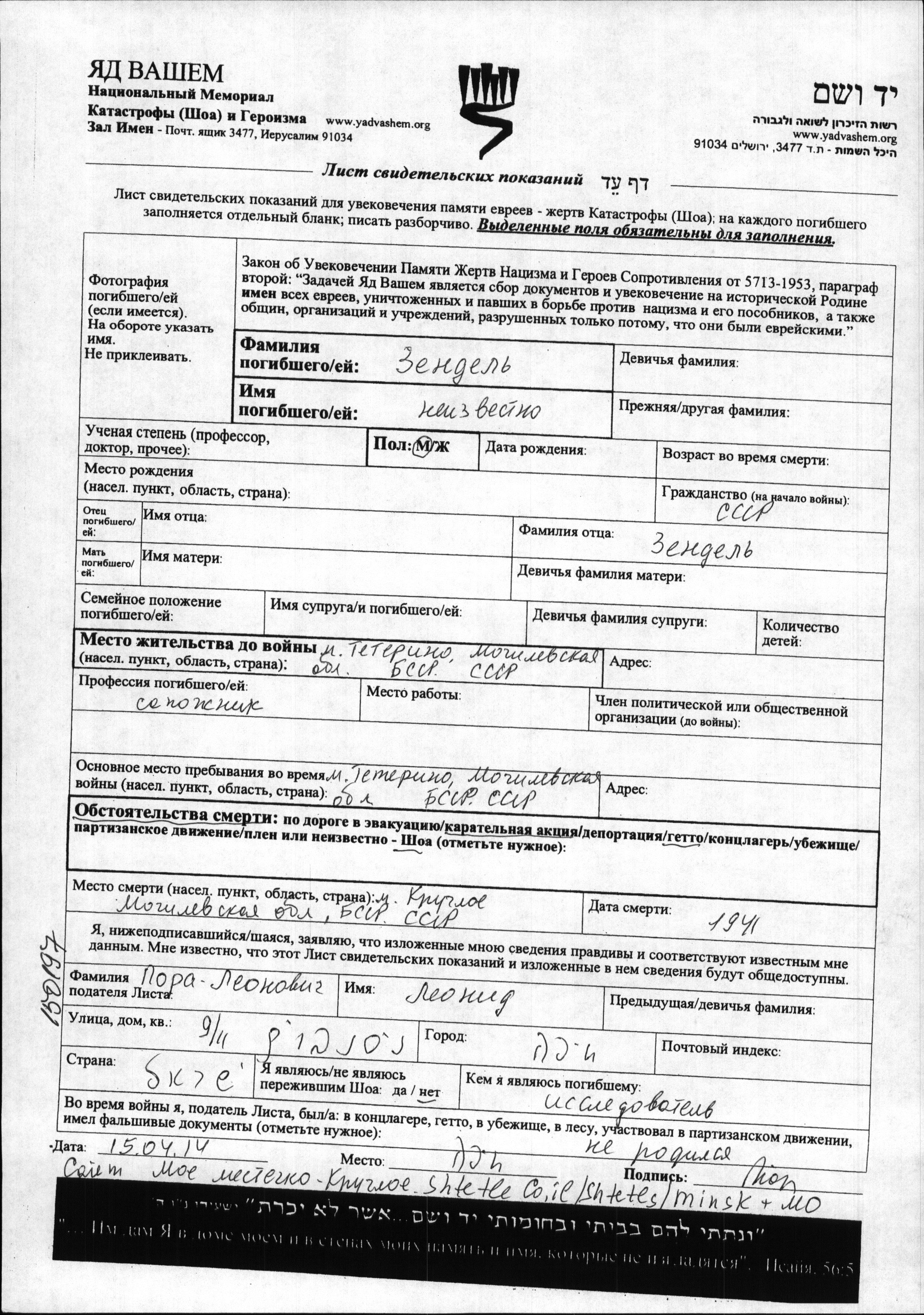 First name unknown Zendel. He was a shoemaker. Prior to WWII he lived in Teterino, Belorussia (USSR). During the war he was in Teterino, Belorussia (USSR). He was murdered in the Shoah. Place of death: Krugloye, Belorussia (USSR), 1941.