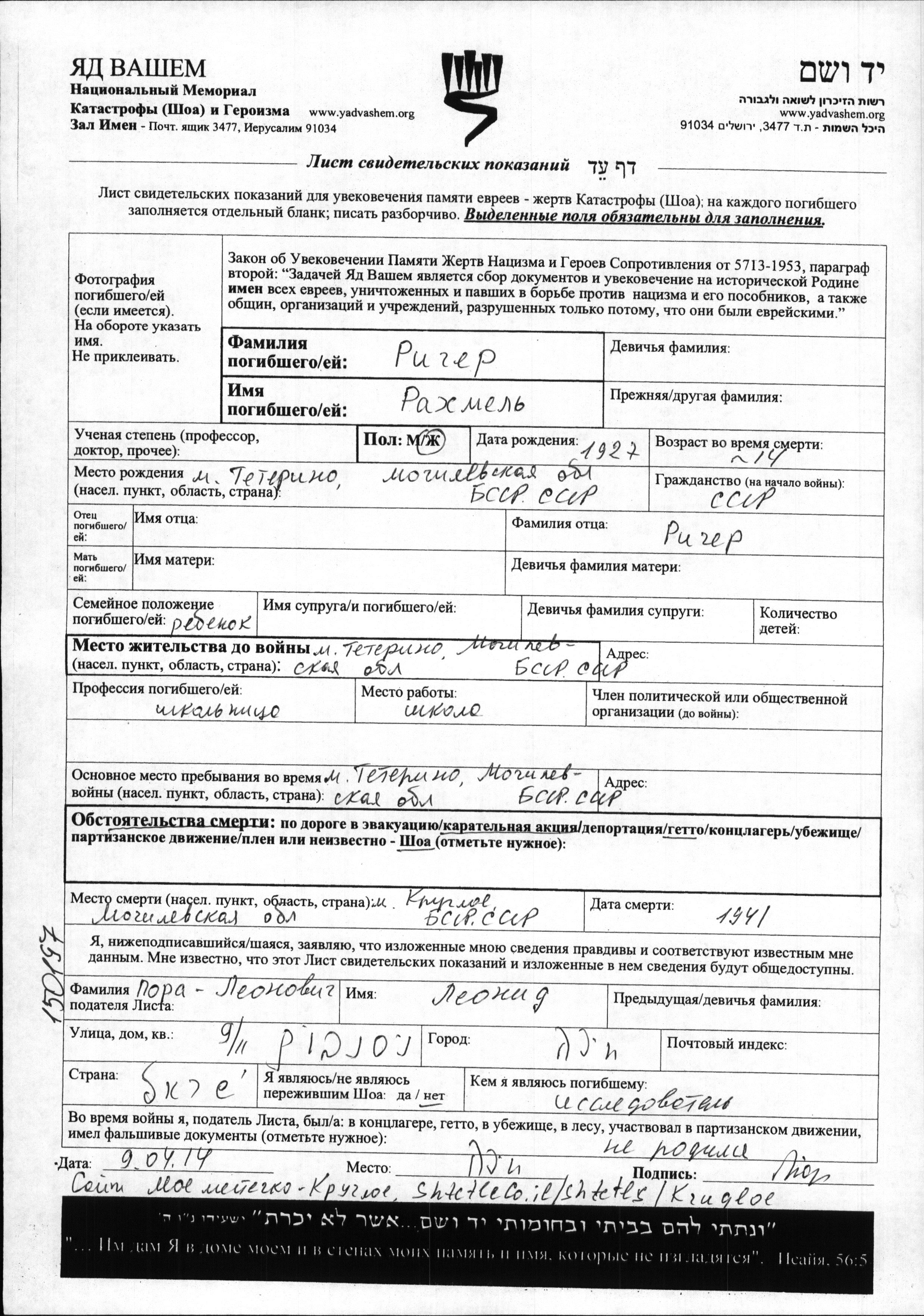 Riger Rakhmel 1927 Teterino, Belorussia (USSR) Page of Testimony