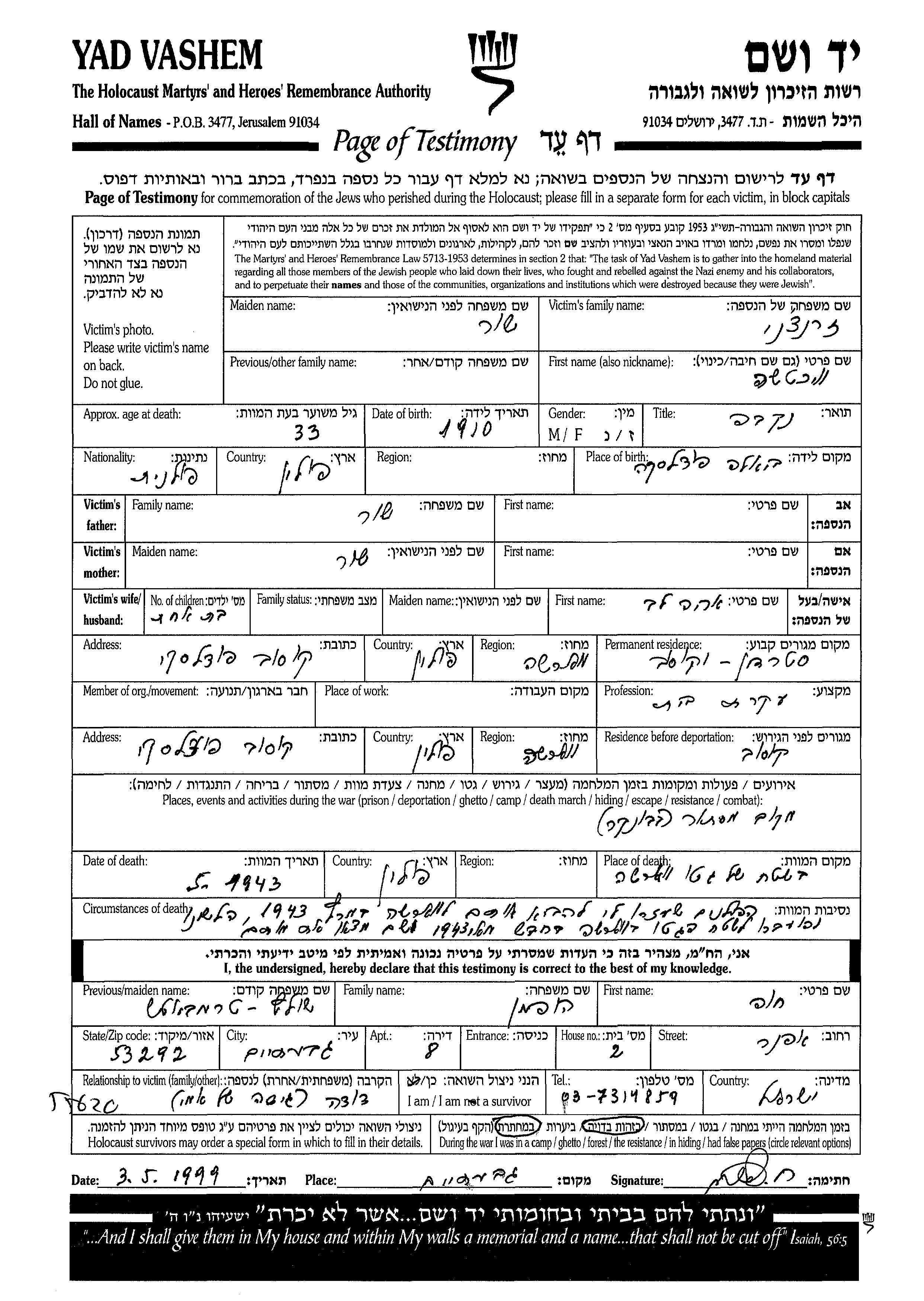 Vikcha Zrenchni nee Shur was born in Biala Podlaska, Poland, 1910. She was a housewife and married to Arie Lev. Prior to WWII she lived in Sterdyn, Poland. During the war she was in Sterdyn, Poland. Vikcha was murdered in the Shoah. Place of death: Warszawa, Poland, 05/1943.