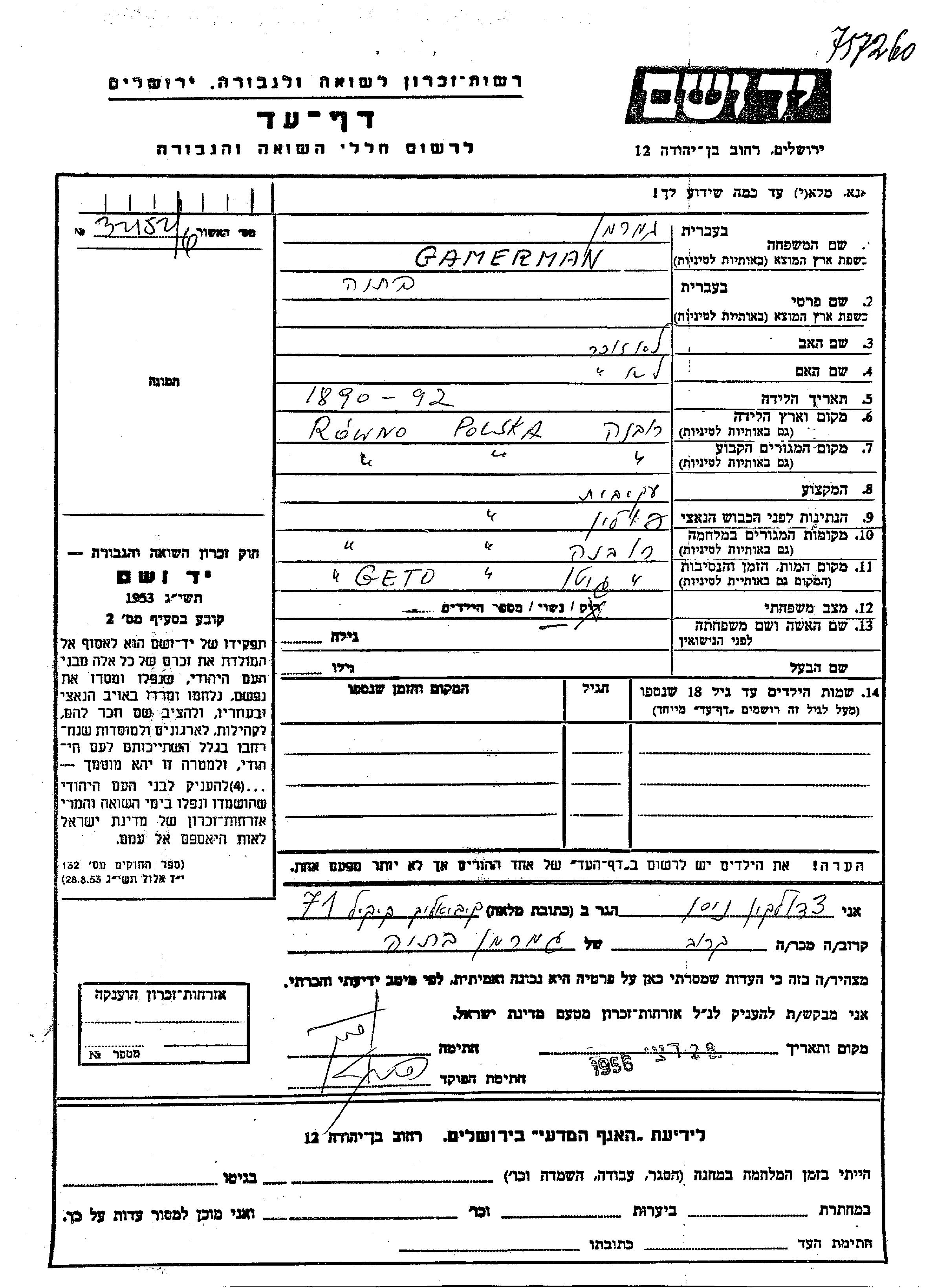 Batia Gamerman was born in Rowno, Poland, 1890. She was a housewife and married. Prior to WWII she lived in Rowno, Poland. During the war she was in Rowno, Poland. Batia was murdered in the Shoah. Place of death: Rowno, Poland.