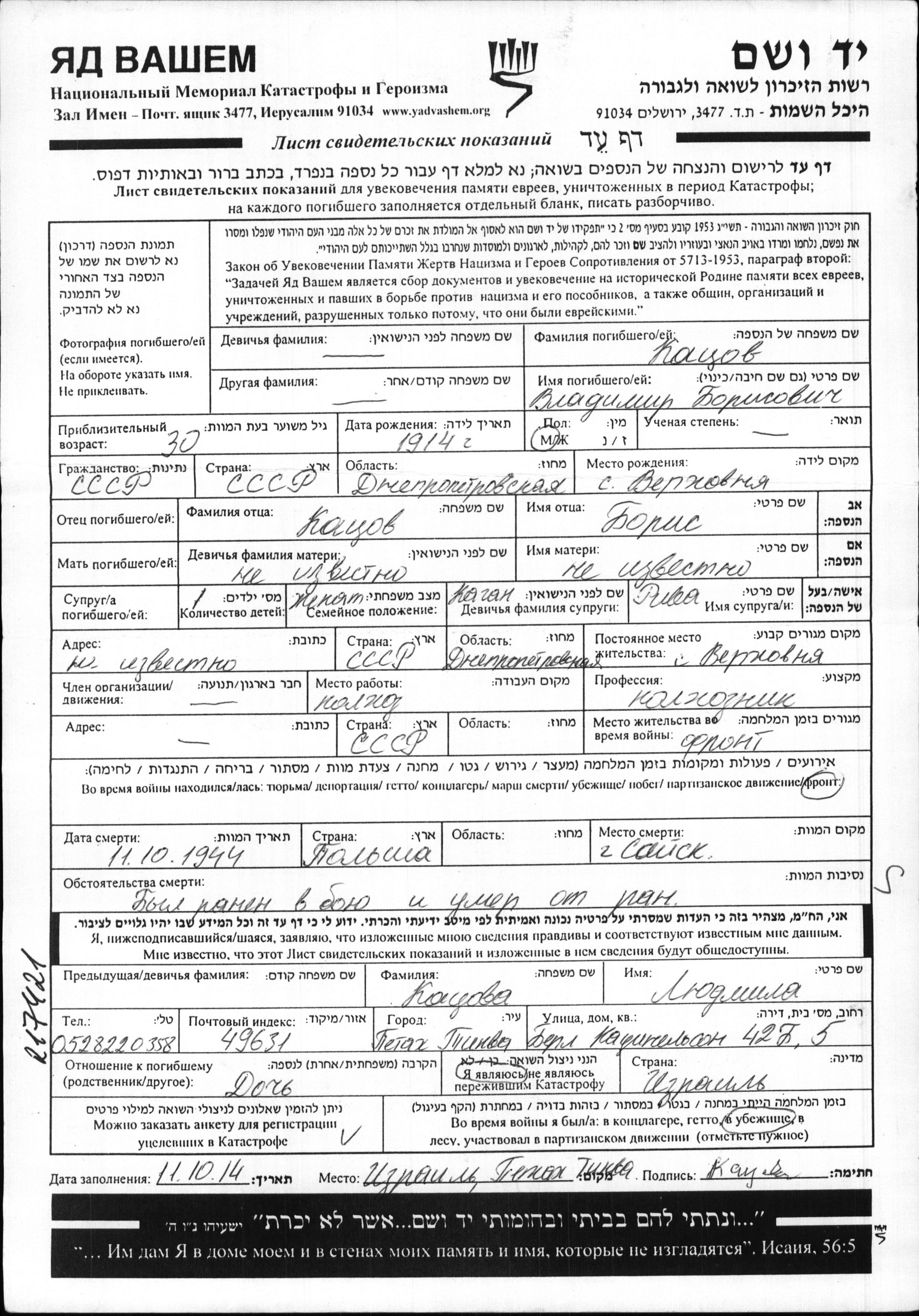 Vladimir Katzov was born in Verkhovnya, Ukraine (USSR), 1914 to Boris. He was a kolkhoznik / kolkhoznitza and married to Riva nee Kagan. Prior to WWII he lived in Verkhovnya, Ukraine (USSR). During the war he was in the Soviet armed forces. Vladimir was killed in military service in WWII. Place of death: Poland, 11/10/1944.