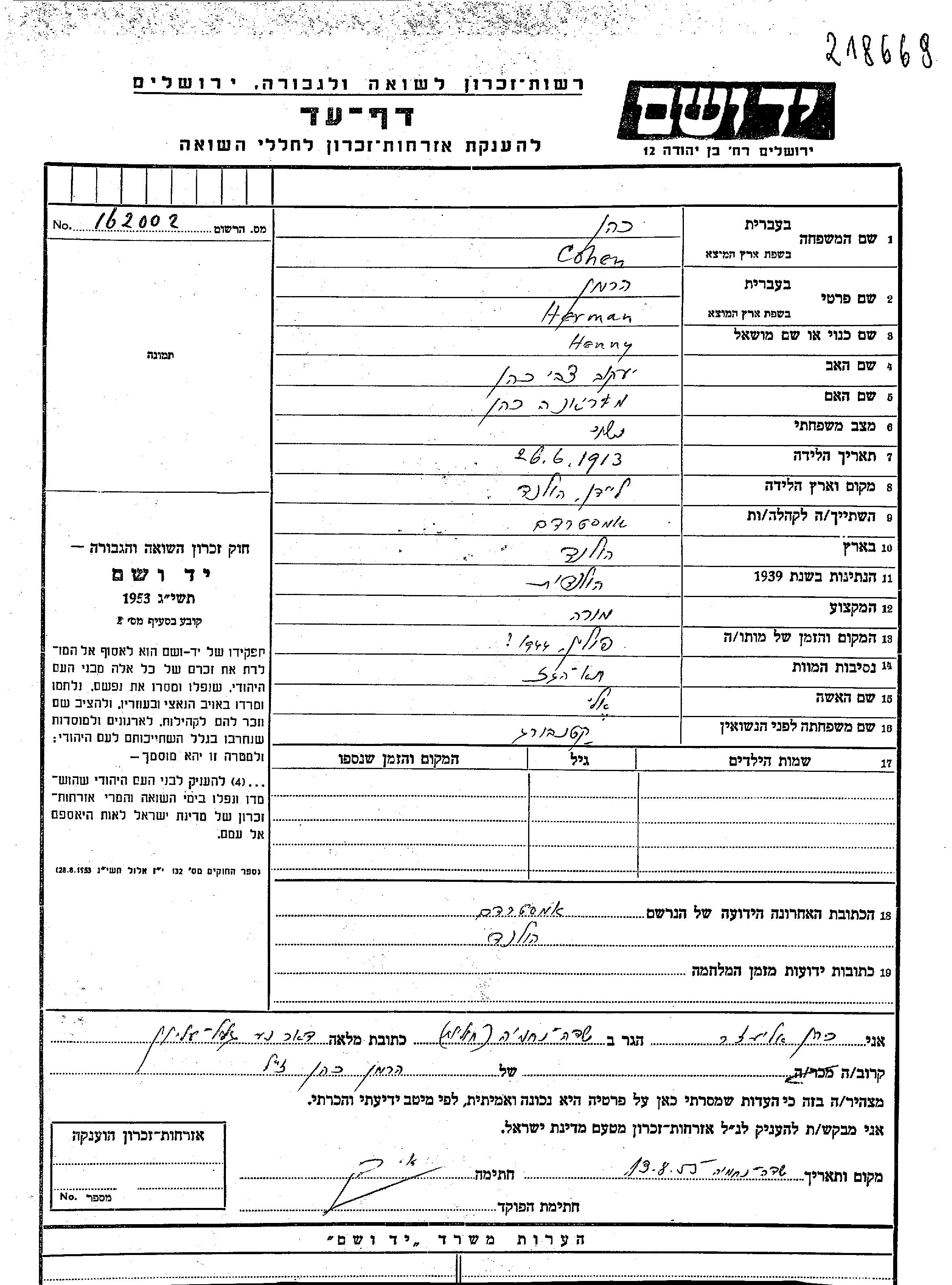 Cohen | Herman Heni | Amsterdam, The Netherlands | Page of Testimony | |