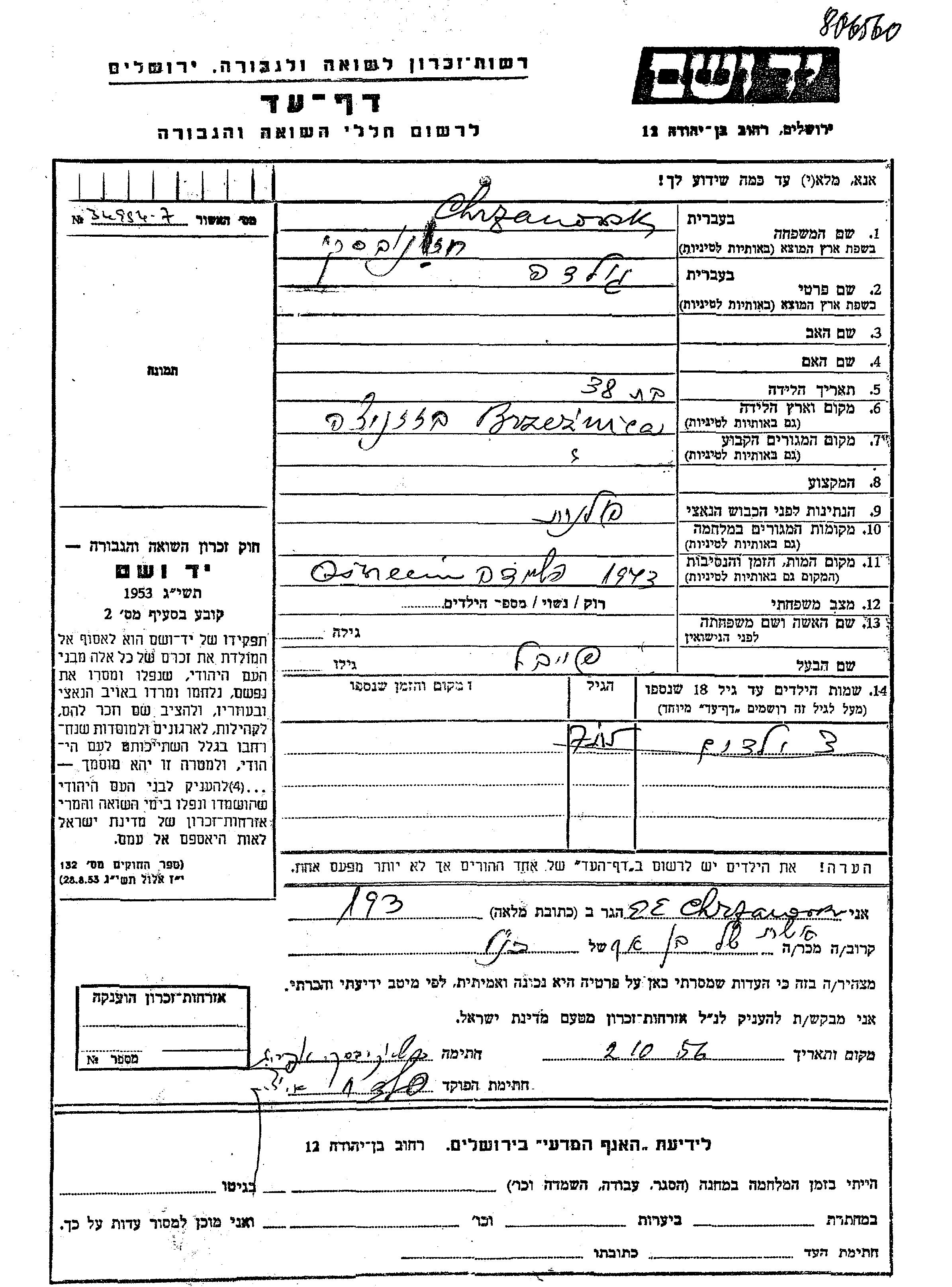 Golda Chrzanowski Khazanovski was born in Brzeznica, Poland. She was married to Faivel. Prior to WWII she lived in Brzeznica, Poland. Golda was murdered in the Shoah. Place of death: Auschwitz, Poland, 1943.