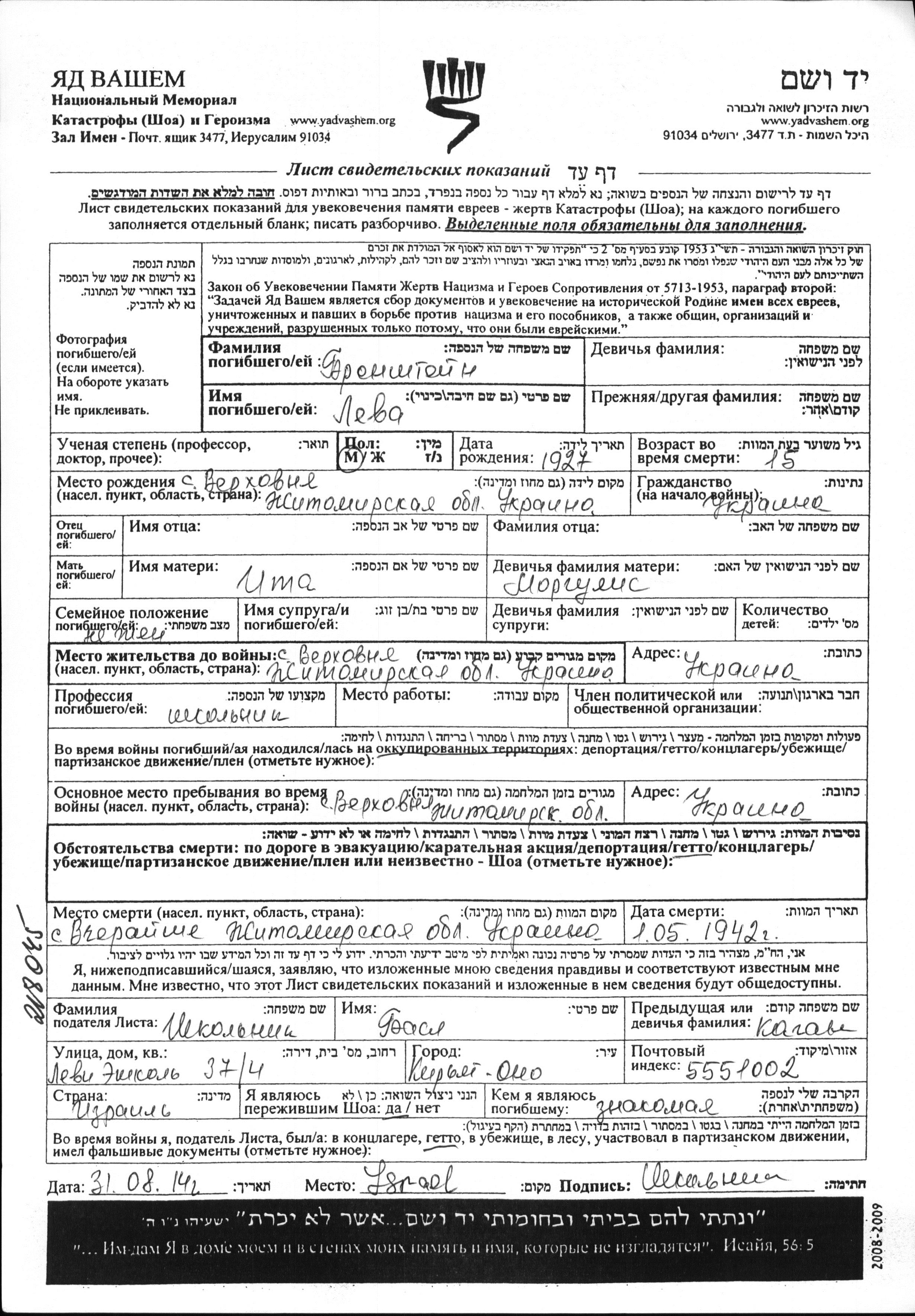 Lyova Bronshtein was born in Verkhovnya, Ukraine (USSR), 1927 to Ita nee Morgulis. He was a pupil and teenager. Prior to WWII he lived in Verkhovnya, Ukraine (USSR). During the war he was in Verkhovnya, Ukraine (USSR). Lyova was killed in military service in WWII. Place of death: Vcherayshe, Ukraine (USSR), 01/05/1942.