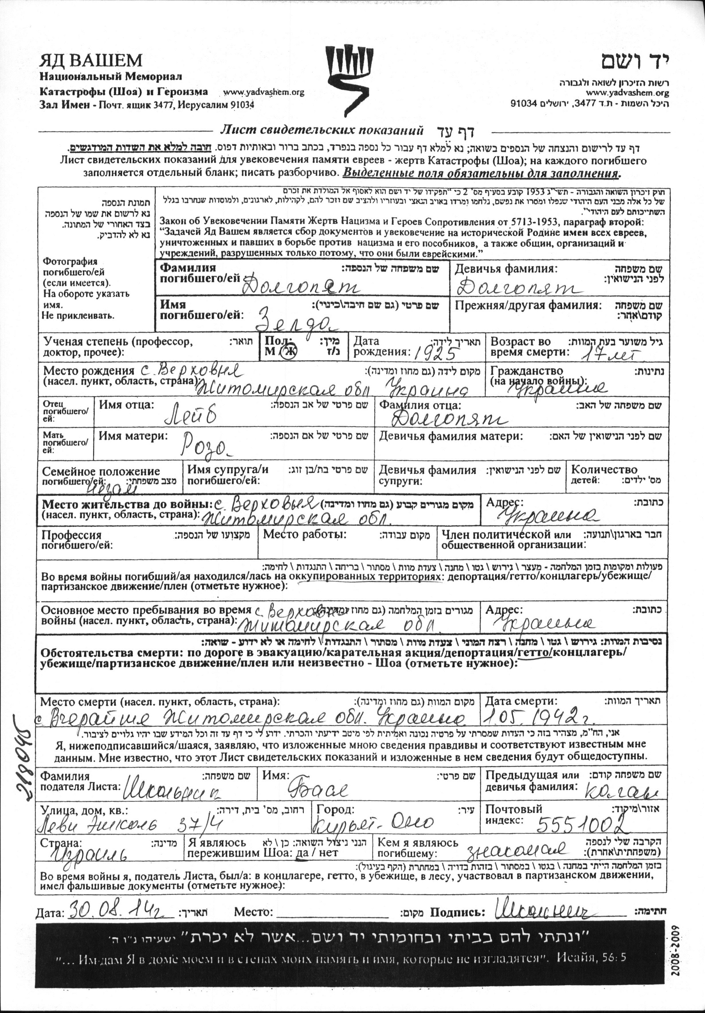 Zelda Dolgopyat was born in Verkhovnya, Ukraine (USSR), 1925 to Leyb and Roza. She was teenager. Prior to WWII she lived in Verkhovnya, Ukraine (USSR). During the war she was in Verkhovnya, Ukraine (USSR). Zelda was murdered in the Shoah. Place of death: Vcherayshe, Ukraine (USSR), 01/05/1942.
