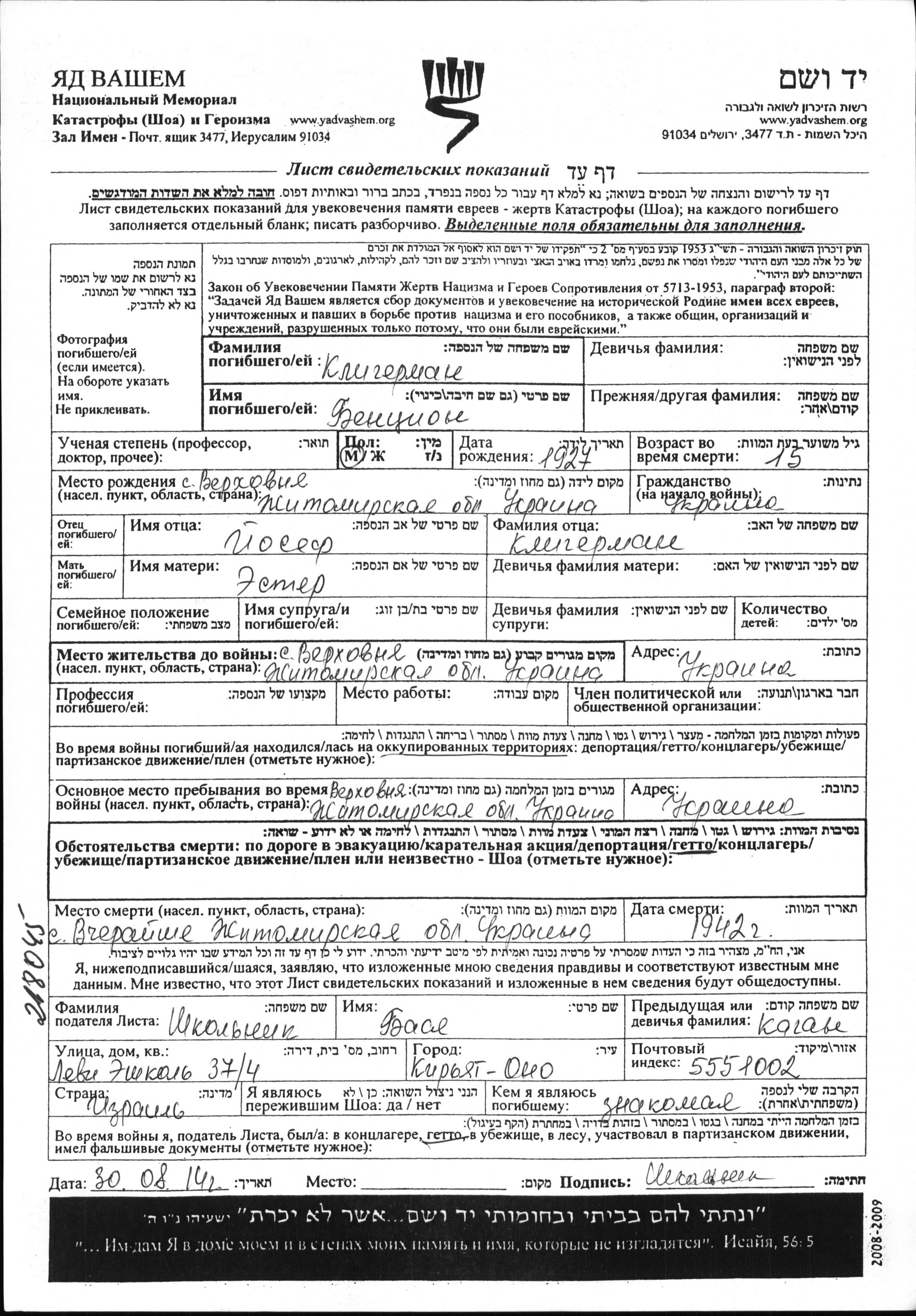 Kligerman Bentzion 1927 Verkhovnya, Ukraine (USSR) Page of Testimony