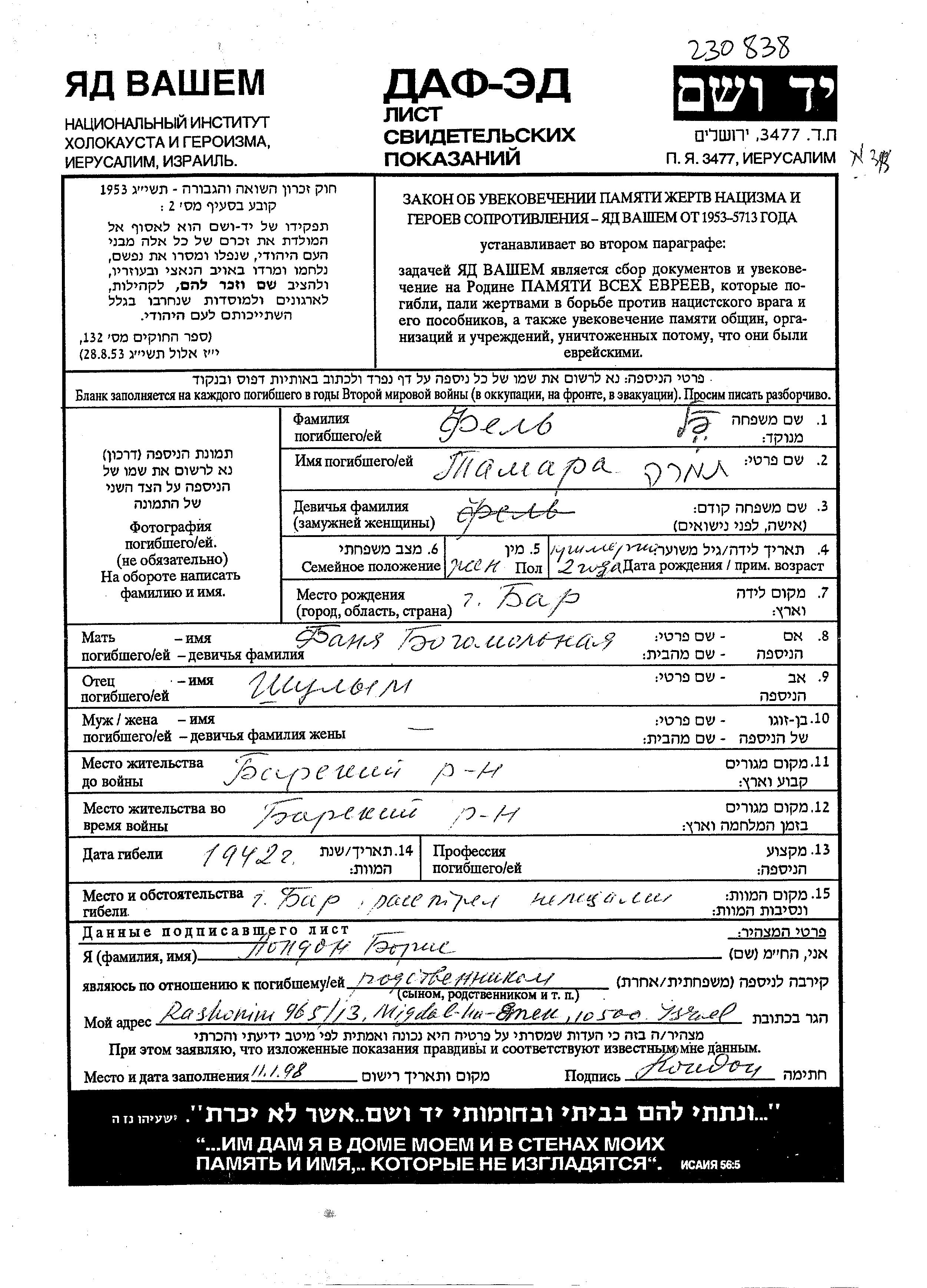 Yad Vashem - Pages of Testimony Names Memorial Collection