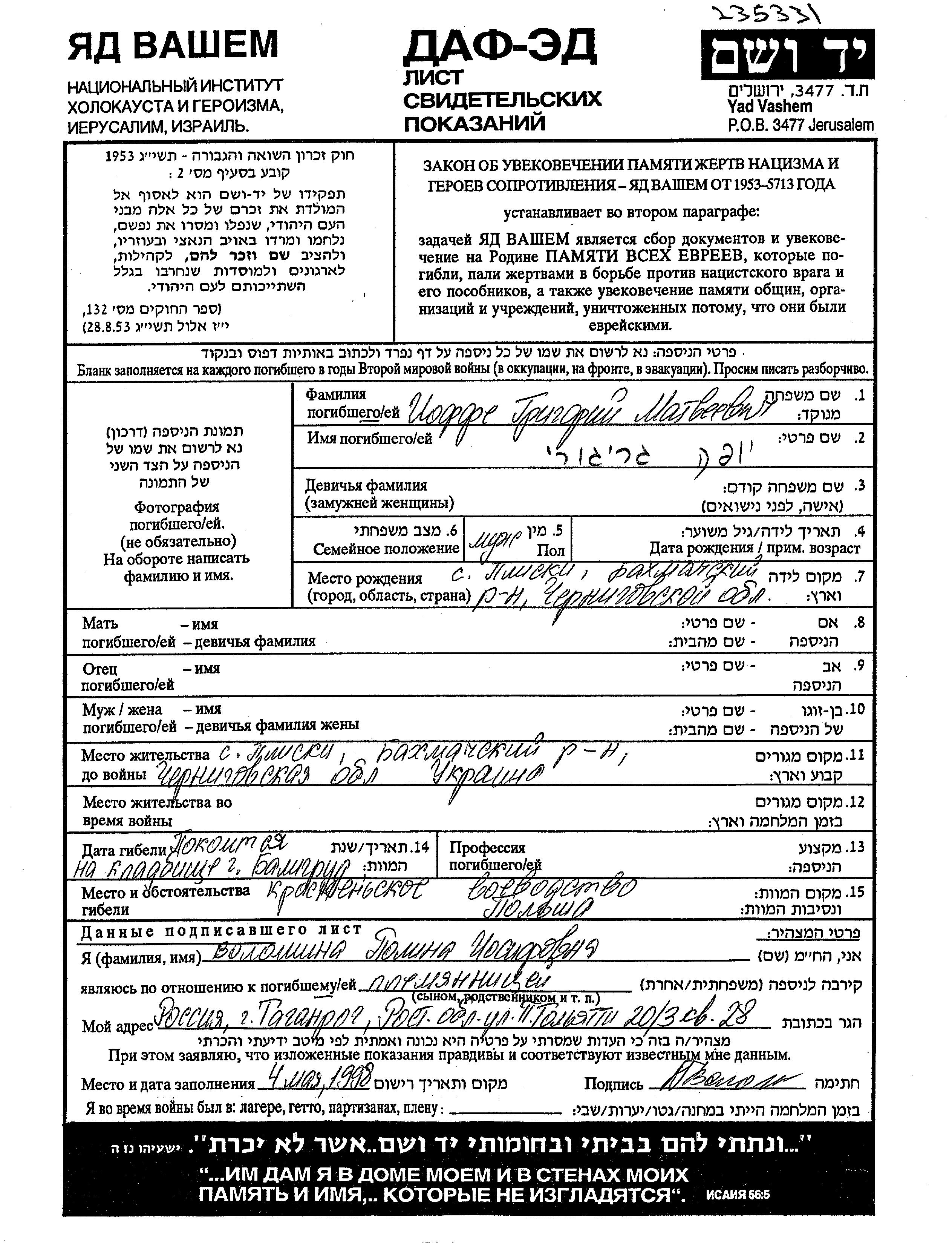 Grigory Ioffe was born in Pliski, Ukraine (USSR) to Matvei. Prior to WWII he lived in Pliski, Ukraine (USSR). Grigory was murdered in the Shoah. Place of death: Krasnenkoye, Ukraine (USSR).