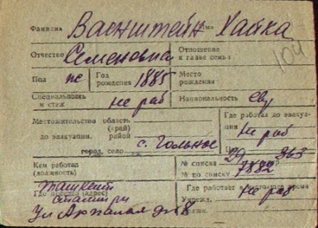 Khayka Vayenshteyn was born, 1885 to Semen. Prior to WWII she lived in Solenoye, Ukraine (USSR). During the war she was in Uzbekistan (USSR). Khayka was registered following the evacuation/ in the interior of the Soviet Union.