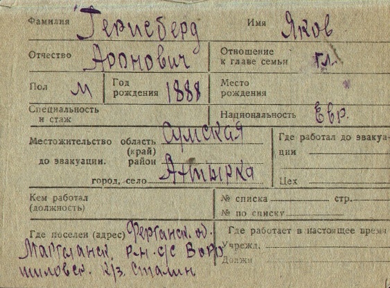 Yakov Gerisberd was born, 1888 to Aron. Prior to WWII he lived in Akhtyrka, Ukraine (USSR). During the war he was in Uzbekistan (USSR). Yakov was registered following the evacuation/ in the interior of the Soviet Union.