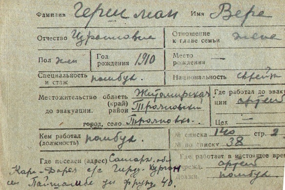 Vera Gershman was born, 1910 to Izrail. Prior to WWII she lived in Troyanov, Ukraine (USSR). During the war she was in Uzbekistan (USSR). Vera was registered following the evacuation/ in the interior of the Soviet Union.