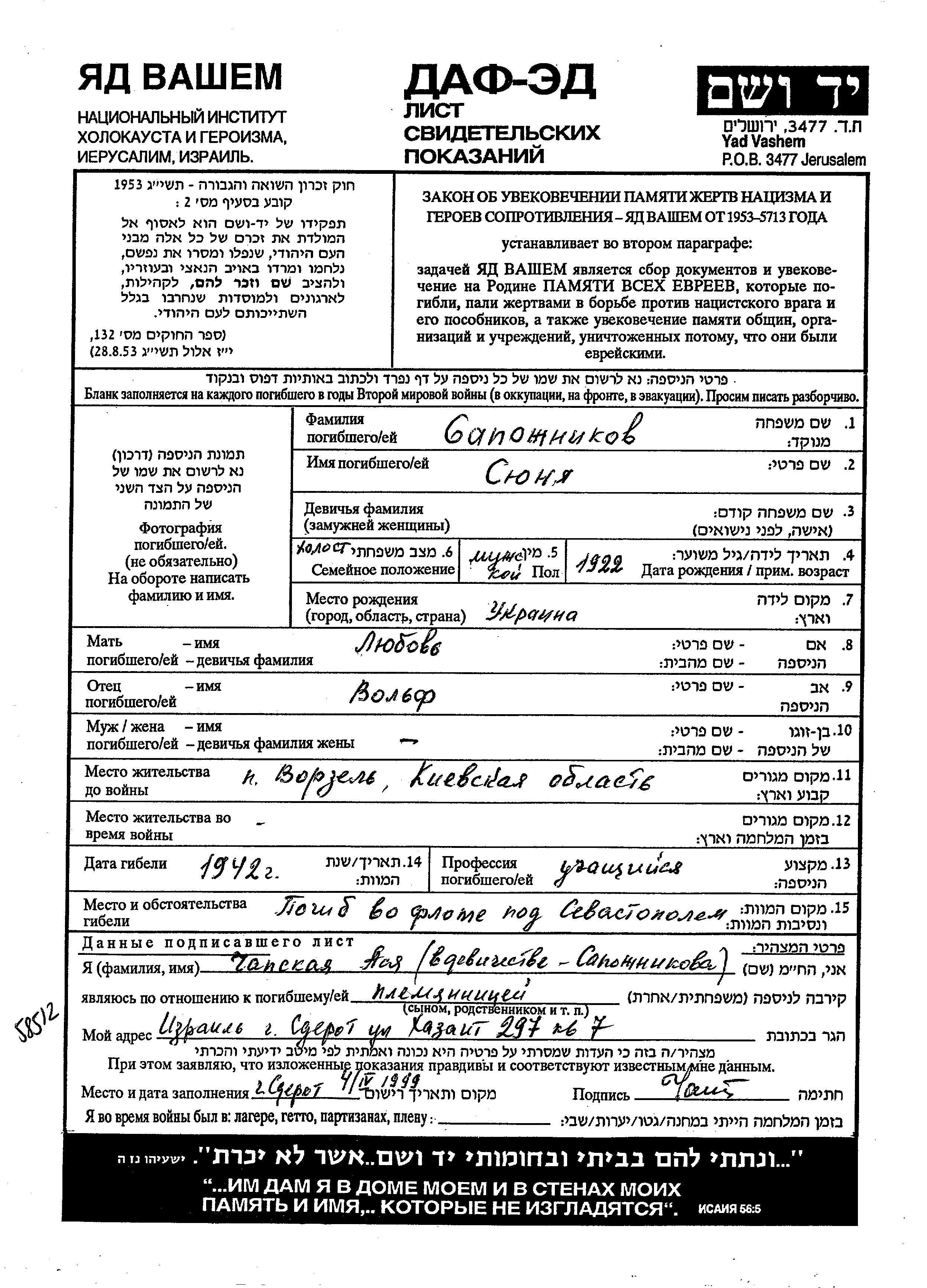 Syunya Sapozhnikov was born in Ukraine (USSR), 1922 to Volf and Liubov. He was a pupil and single. Prior to WWII he lived in Vorzel, Ukraine (USSR). During the war he was in Vorzel, Ukraine (USSR).