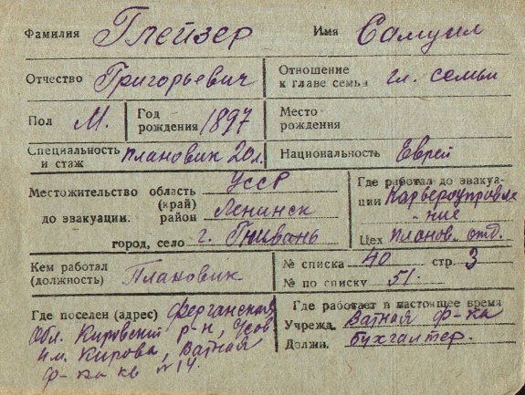 Samuil Gleyzer was born, 1897 to Grigoriy. Prior to WWII he lived in Gnivan, Ukraine (USSR). During the war he was in Uzbekistan (USSR). Samuil was registered following the evacuation/ in the interior of the Soviet Union.