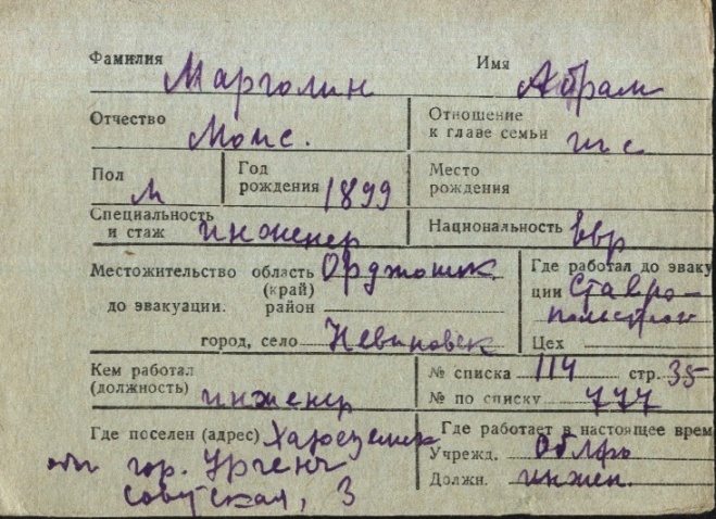 Abram Margolin was born, 1899 to Moisey. Prior to WWII he lived in Nevinnomyssk, Russia (USSR). During the war he was in Uzbekistan (USSR). Abram was registered following the evacuation/ in the interior of the Soviet Union.