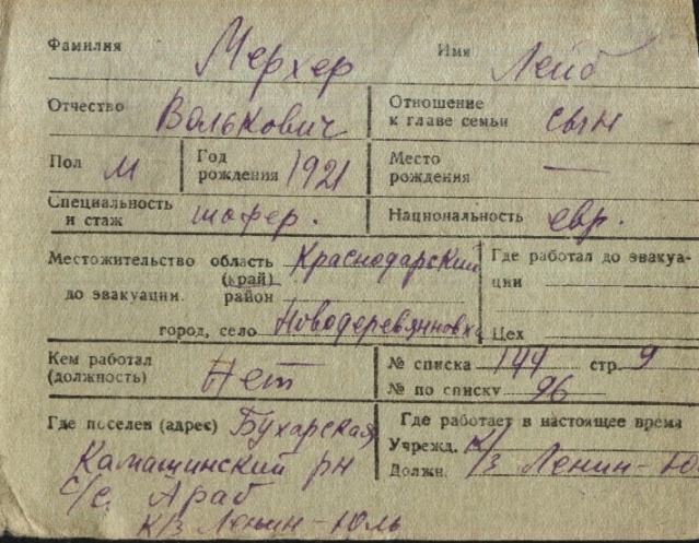 Leyb Merkher was born, 1921 to Volk. Prior to WWII he lived in Novoderevyankovskaya, Russia (USSR). During the war he was in Uzbekistan (USSR). Leyb was registered following the evacuation/ in the interior of the Soviet Union.