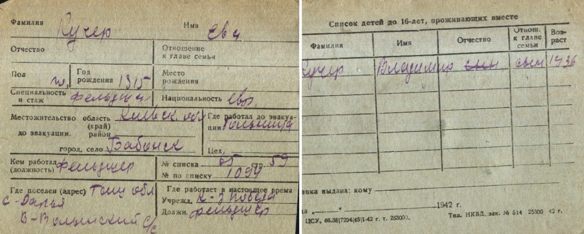 Yeva Kucher was born, 1915. Prior to WWII she lived in Babanka, Ukraine (USSR). During the war she was in Uzbekistan (USSR). Yeva was registered following the evacuation/ in the interior of the Soviet Union.