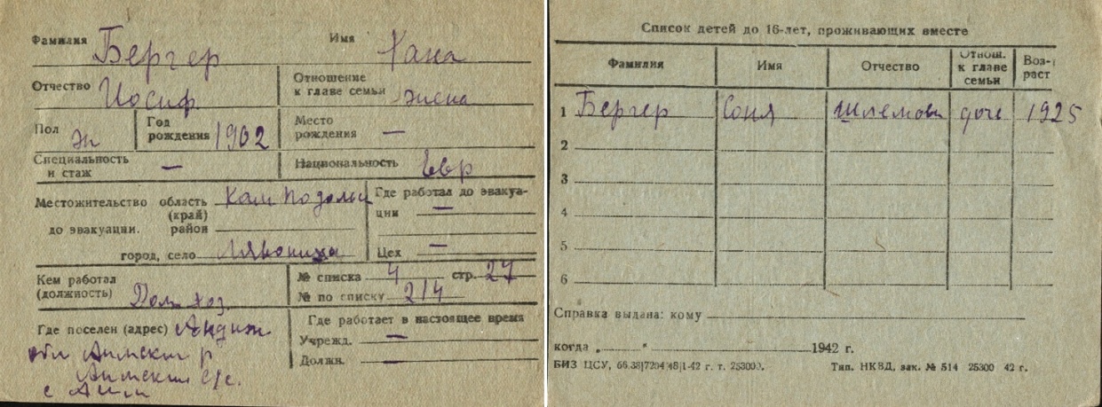 Khana Berger was born, 1902 to Iosif. Prior to WWII she lived in Lyakhovtsy, Ukraine (USSR). During the war she was in Uzbekistan (USSR). Khana was registered following the evacuation/ in the interior of the Soviet Union.