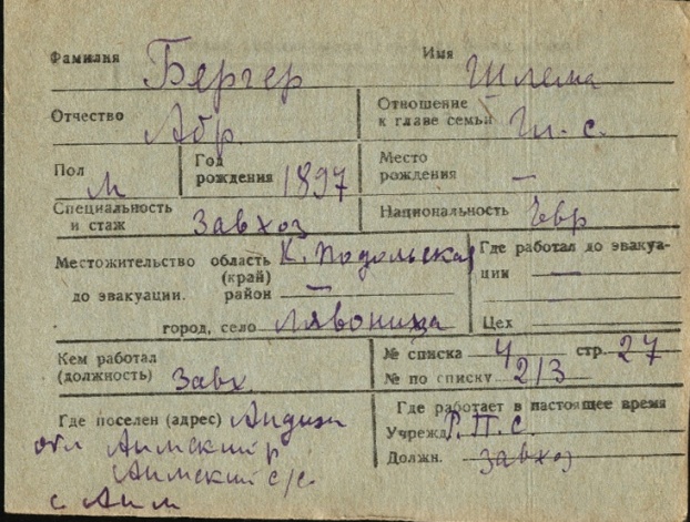 Shlema Berger was born, 1897 to Abram. Prior to WWII he lived in Lyakhovtsy, Ukraine (USSR). During the war he was in Uzbekistan (USSR). Shlema was registered following the evacuation/ in the interior of the Soviet Union.