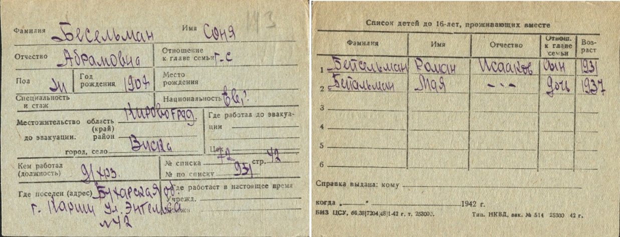 Sonya Beselman was born, 1908 to Abram. Prior to WWII she lived in Malaya Viska, Ukraine (USSR). During the war she was in Uzbekistan (USSR). Sonya was registered following the evacuation/ in the interior of the Soviet Union.