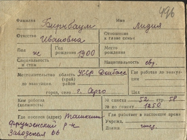 Lidiya Birnbaum was born, 1900 to Ivan. Prior to WWII she lived in Sergo, Ukraine (USSR). During the war she was in Uzbekistan (USSR). Lidiya was registered following the evacuation/ in the interior of the Soviet Union.