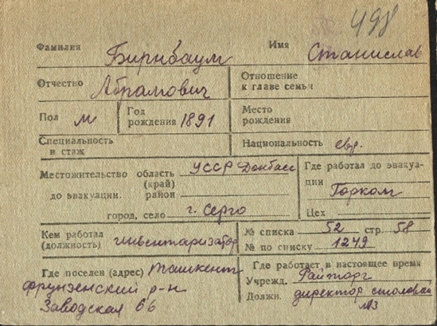 Stanislav Birnbaum was born, 1891 to Abram. Prior to WWII he lived in Sergo, Ukraine (USSR). During the war he was in Uzbekistan (USSR). Stanislav was registered following the evacuation/ in the interior of the Soviet Union.