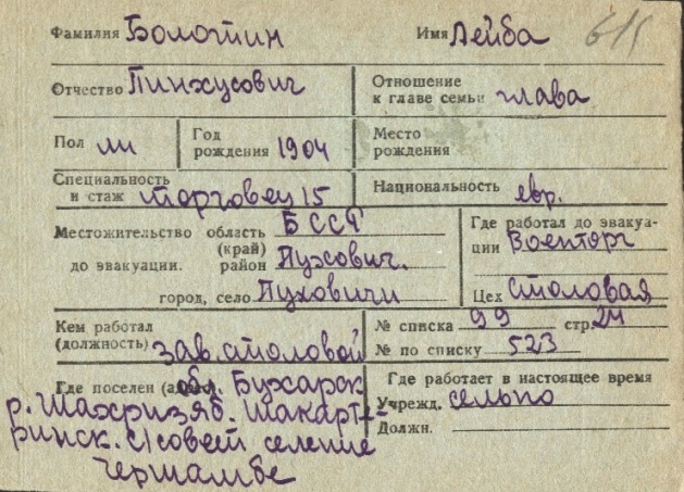 Leyba Bolotin was born, 1904 to Pinkhus. Prior to WWII he lived in Pukhovichi, Belorussia (USSR). During the war he was in Uzbekistan (USSR). Leyba was registered following the evacuation/ in the interior of the Soviet Union.