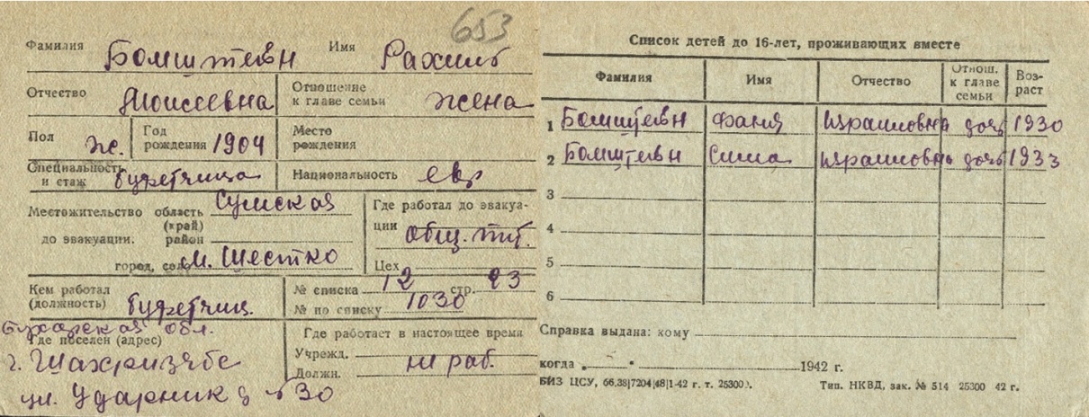 Rakhil Bomshteyn was born, 1904 to Moisey. Prior to WWII she lived in Shostka, Ukraine (USSR). During the war she was in Uzbekistan (USSR). Rakhil was registered following the evacuation/ in the interior of the Soviet Union.