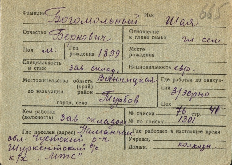 Shaya Bogomolnyi was born, 1899 to Berko. Prior to WWII he lived in Turbov, Ukraine (USSR). During the war he was in Uzbekistan (USSR). Shaya was registered following the evacuation/ in the interior of the Soviet Union.