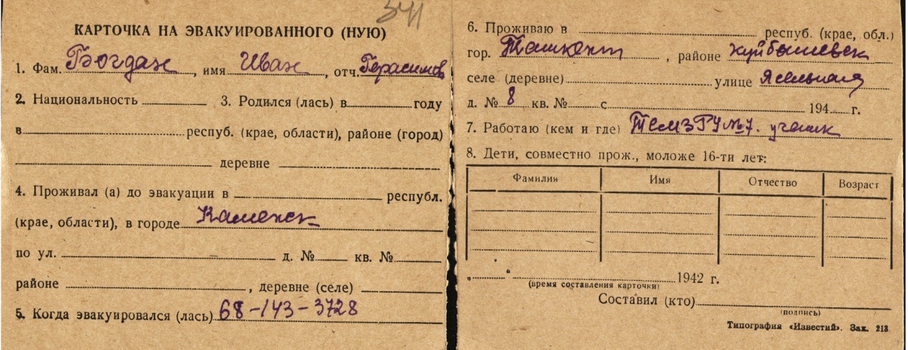 Ivan Bogdan was born to Gerasim. Prior to WWII he lived in Kamenka, Ukraine (USSR). During the war he was in Uzbekistan (USSR). Ivan was registered following the evacuation/ in the interior of the Soviet Union.