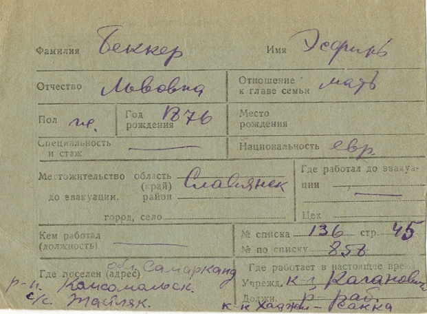 Esfir Bekker was born, 1876 to Lev. Prior to WWII she lived in Slavyansk, Ukraine (USSR). During the war she was in Uzbekistan (USSR). Esfir was registered following the evacuation/ in the interior of the Soviet Union.