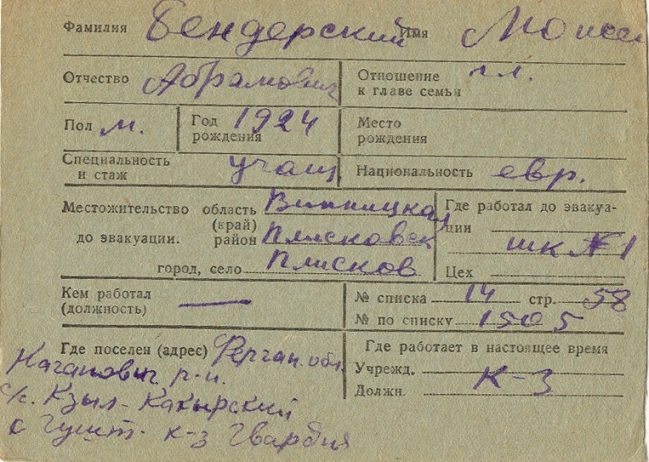 Moisey Benderskiy was born, 1924 to Abram. Prior to WWII he lived in Pliskov, Ukraine (USSR). During the war he was in Uzbekistan (USSR). Moisey was registered following the evacuation/ in the interior of the Soviet Union.