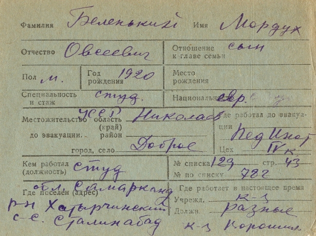 Mordukh Belenkiy was born, 1920 to Ovsey. Prior to WWII he lived in Dobroye, Ukraine (USSR). During the war he was in Uzbekistan (USSR). Mordukh was registered following the evacuation/ in the interior of the Soviet Union.